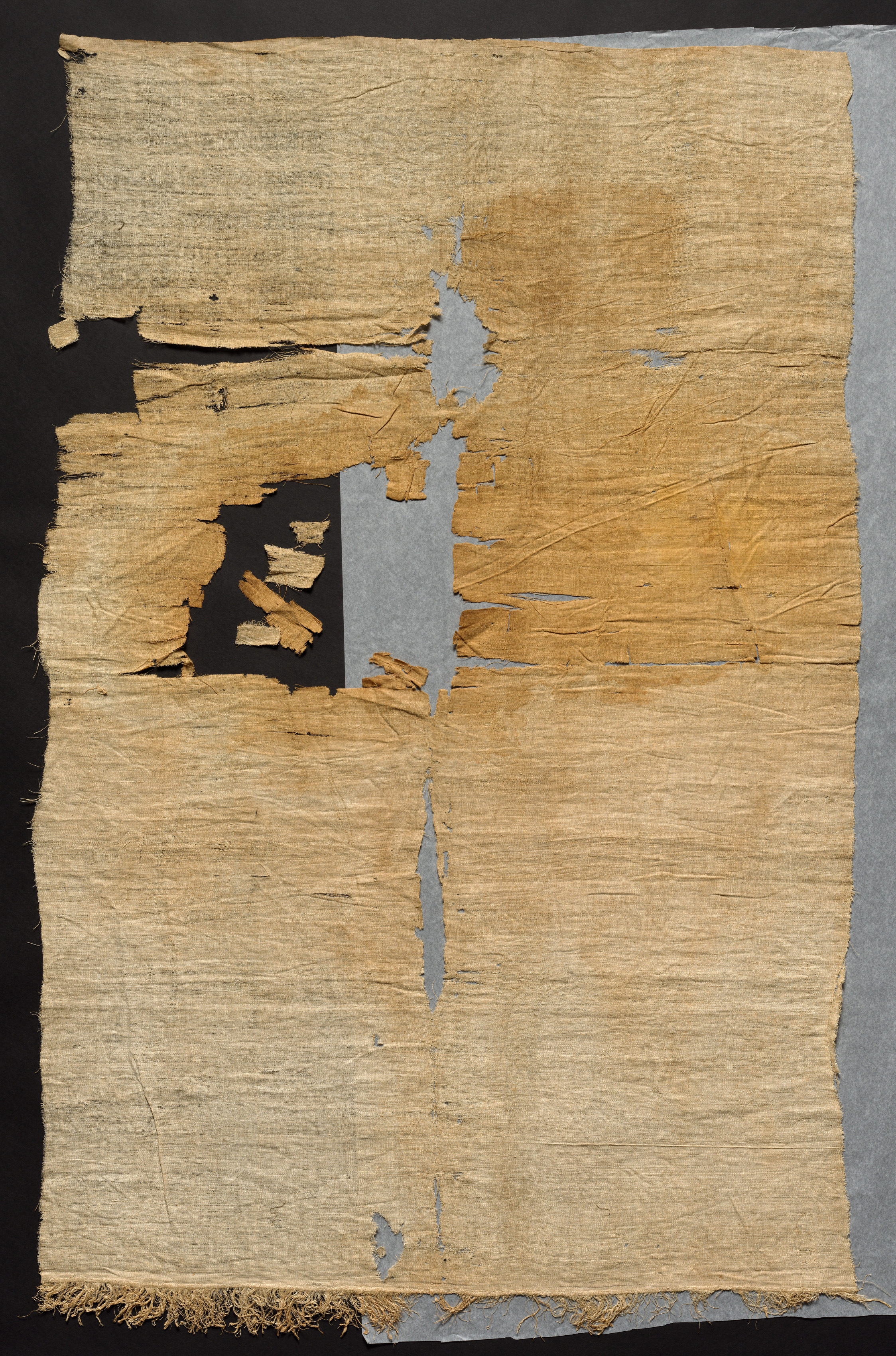 Mummy Linen by Robert Rauschenberg. A large piece of off-white, beige-colored linen with a rough, frayed edge at the bottom. The fabric appears to be old and worn, with several areas of damage including tears, frays, and discoloration. There are several holes and gaps in the fabric. The fabric is mounted on a gray backing material, visible through the tears and holes. The background behind the linen is black.