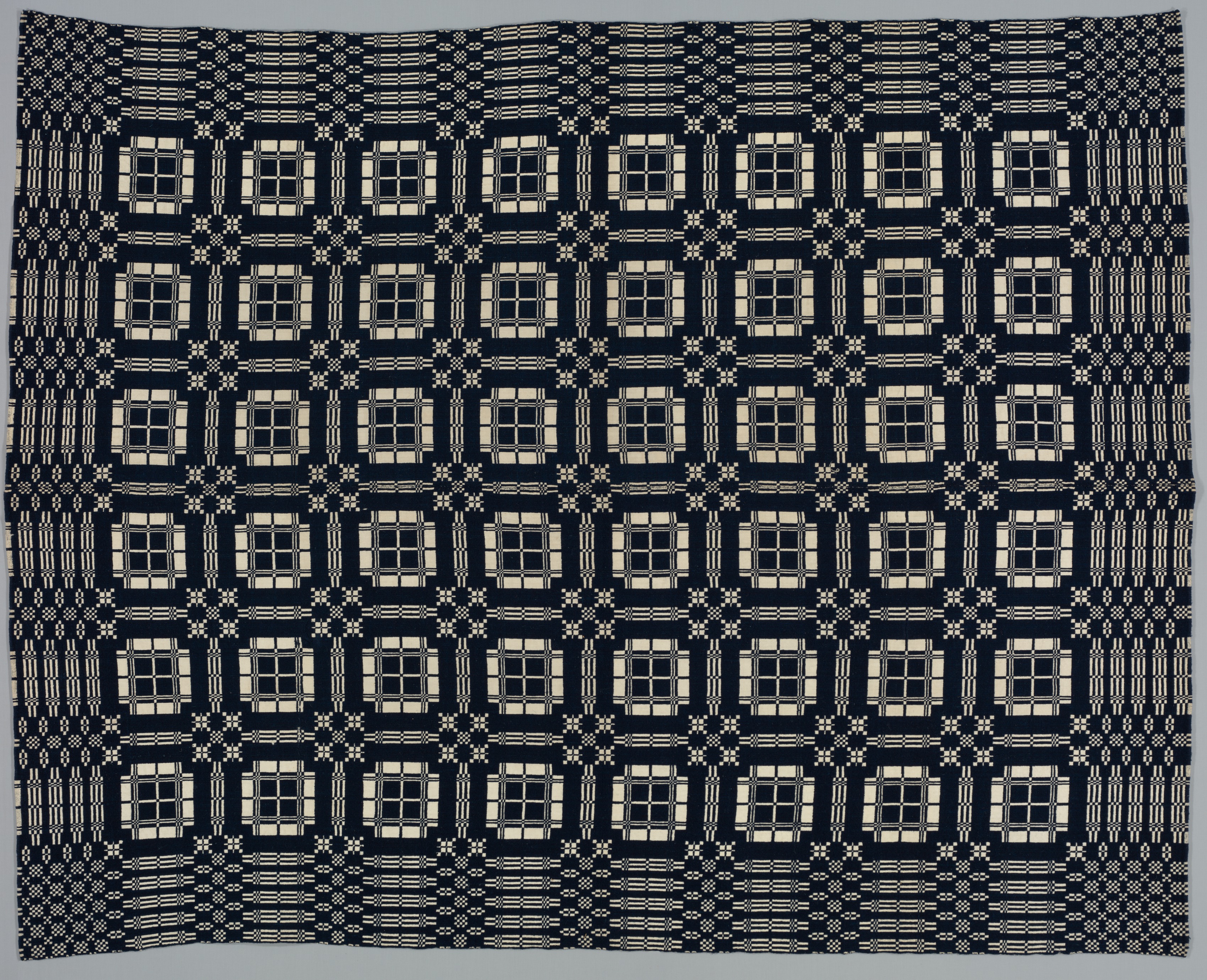 Black and cream-colored coverlet with a grid pattern featuring squares and rectangles. The grid consists of 7 columns and 6 rows of a repeating pattern. Each central square in the grid has a 3x3 grid of squares inside. The central square is surrounded by a square of 4 rectangles, one on each side, pointing inward. Between the central squares are 4-pointed starburst shapes. The border on either side consists of 2 columns; one has horizontal lines with rectangles and the other has a zig-zag pattern. The coverlet fills most of the frame.