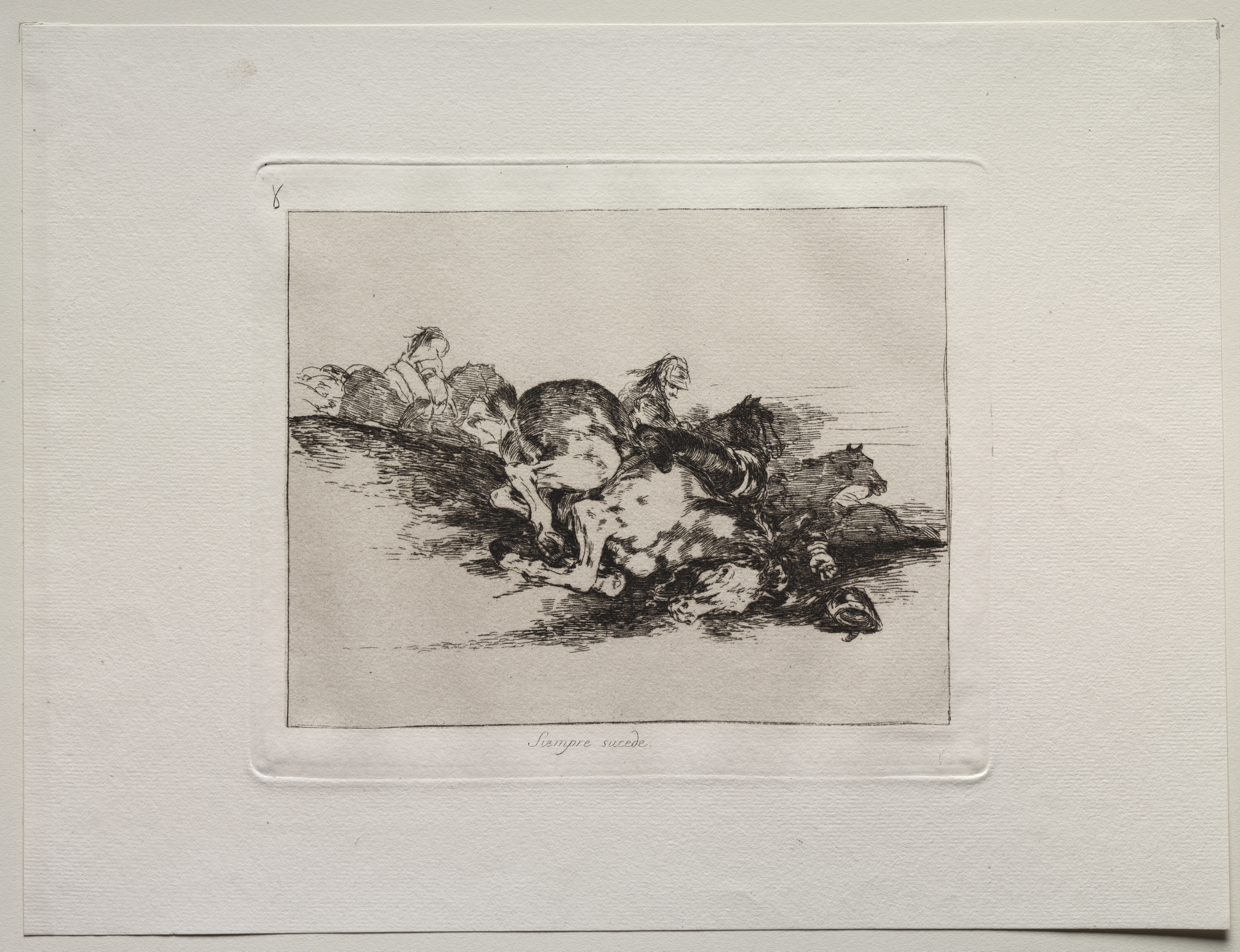 Black and white artwork on a white background. A group of bodies on the ground. Central figure on their knees; head tilted down; screaming; right arm bent at elbow; hand clenched; left arm extended; hand on the ground; head facing left. Two bodies on the ground to the right; one body on the ground to the left. A horse's rear end and two legs are on the right; another horse on the left; both are partially visible. The artwork has a thin black border. The words "Siempre sucede" are written in cursive at the bottom.