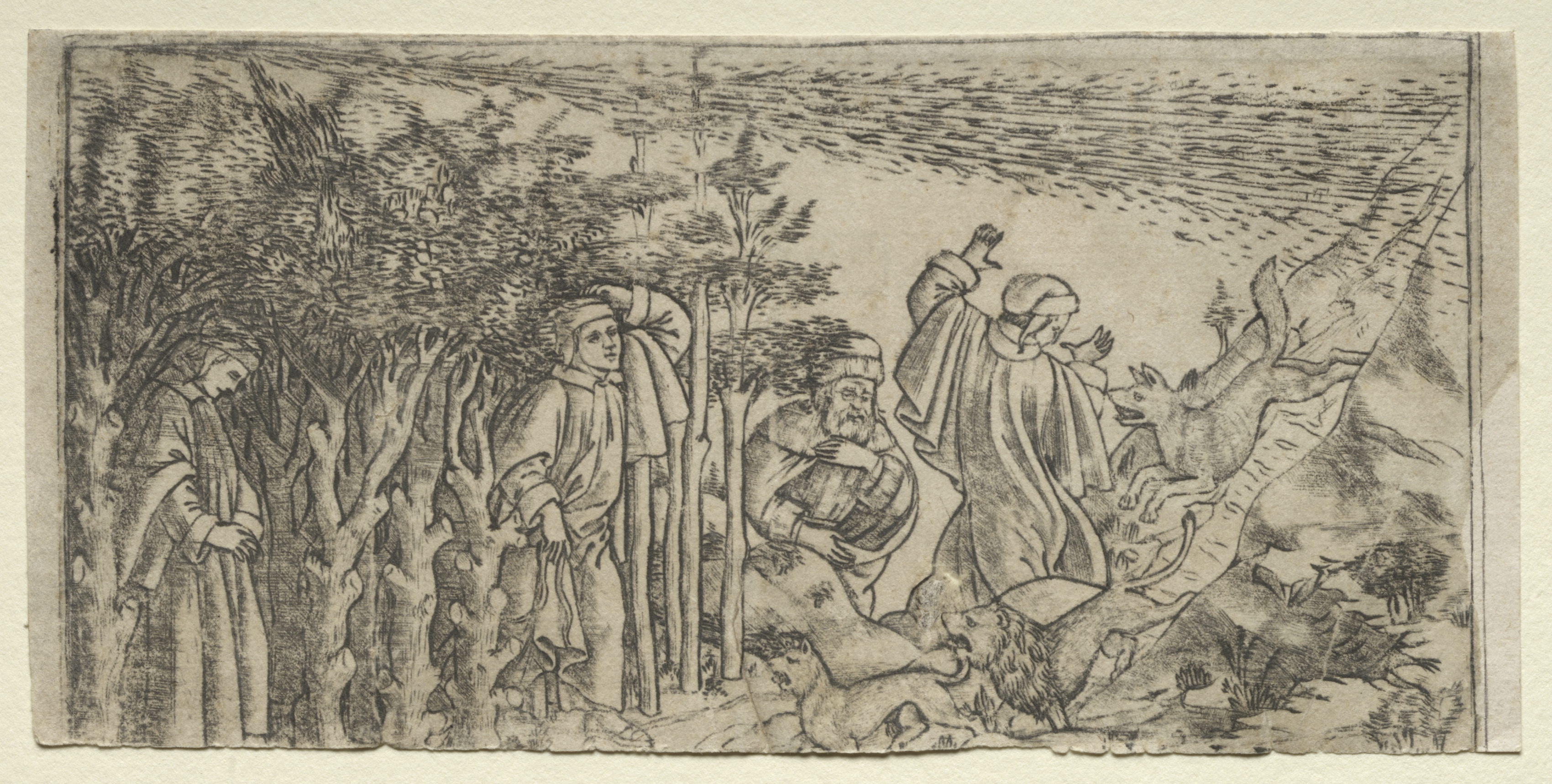 Black and white drawing of a wooded scene. The scene depicts four people in robes. A man on the left wears a long robe and head covering. The head of a second figure covered in a hood is seen behind the trees on the left. The third figure appears to have a barrel on their back and sits on a rock. The fourth figure on the right wears a robe, and a head covering, and raises their arms. Three animals are depicted at the bottom and right of the image: a lion and another quadruped on the ground; a winged creature on the right. The sky has short horizontal lines, and there are trees and bushes throughout. The image is framed by a border.