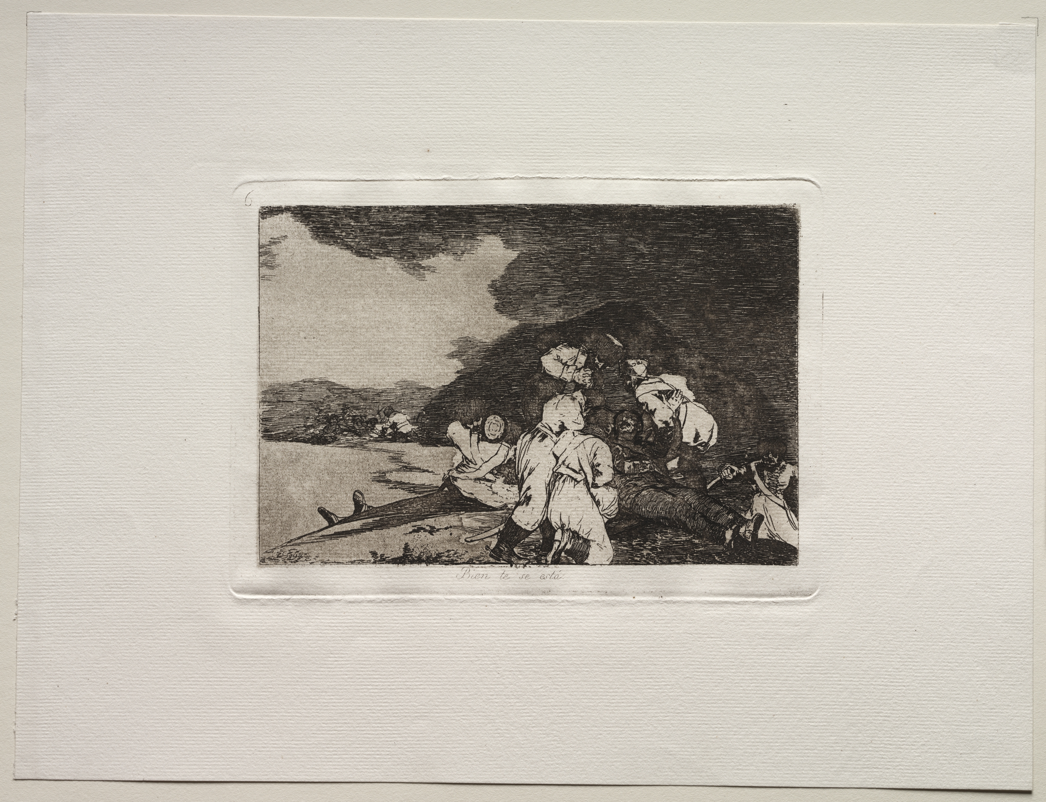 Black and white etching on paper of a scene depicting a group of people, four adults and one child, fleeing from dark smoke on the right side. The group has their backs turned, faces obscured or looking down and are dressed in white shirts and dark pants. A dead or dying man lies on the ground on the left. There are hills in the background on the left under a gray sky. The print is mounted on a larger white background.