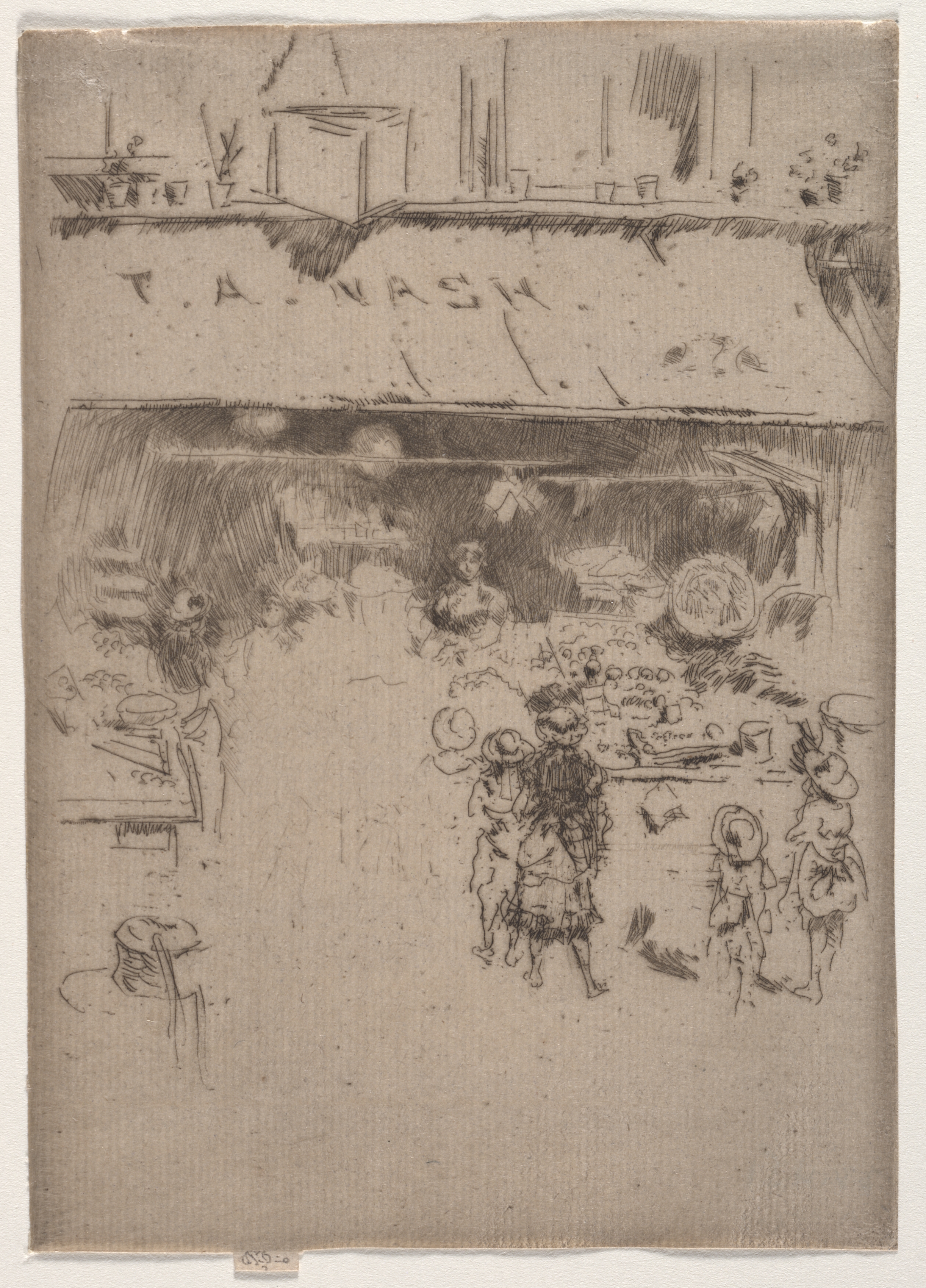 The image depicts a sketch of a fruit shop. A sign above the shop reads "T.A. NASH". The shop's awning is drawn over the top third of the image. The awning's front edge dips in the center. A long table covered with fruit and other items sits under the awning. Three people stand near the table. To the far-left, a figure appears to be sitting on a box or chair. The background is a light brown color. A white border surrounds the image. A small label is placed at the bottom edge.