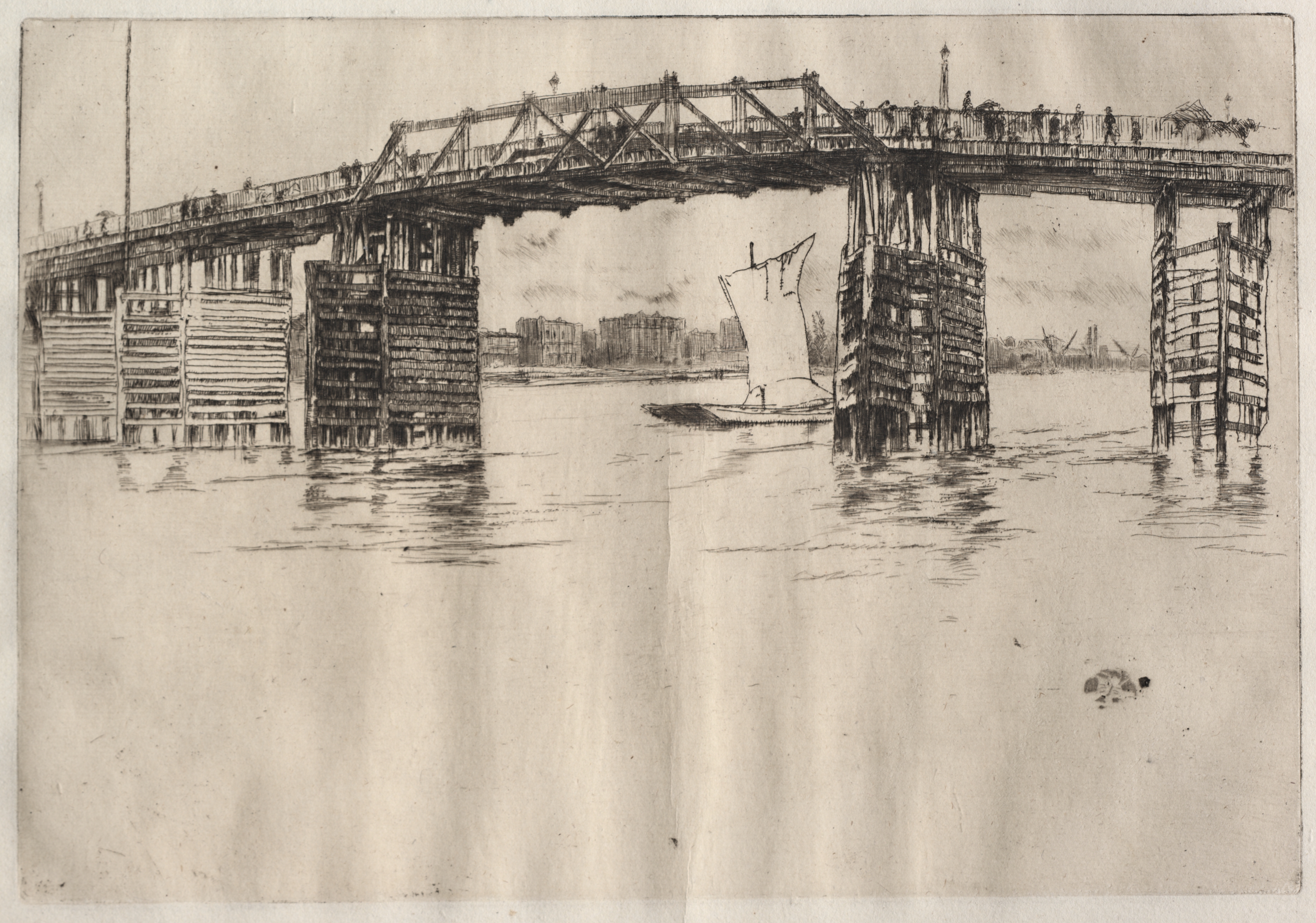 Old Battersea Bridge by James McNeill Whistler. A bridge with a truss structure and people on top spans across a body of water. The bridge has tall piers on either side. A boat with white sails is under the bridge. The bridge and piers are made of wood. The image is in black and white.