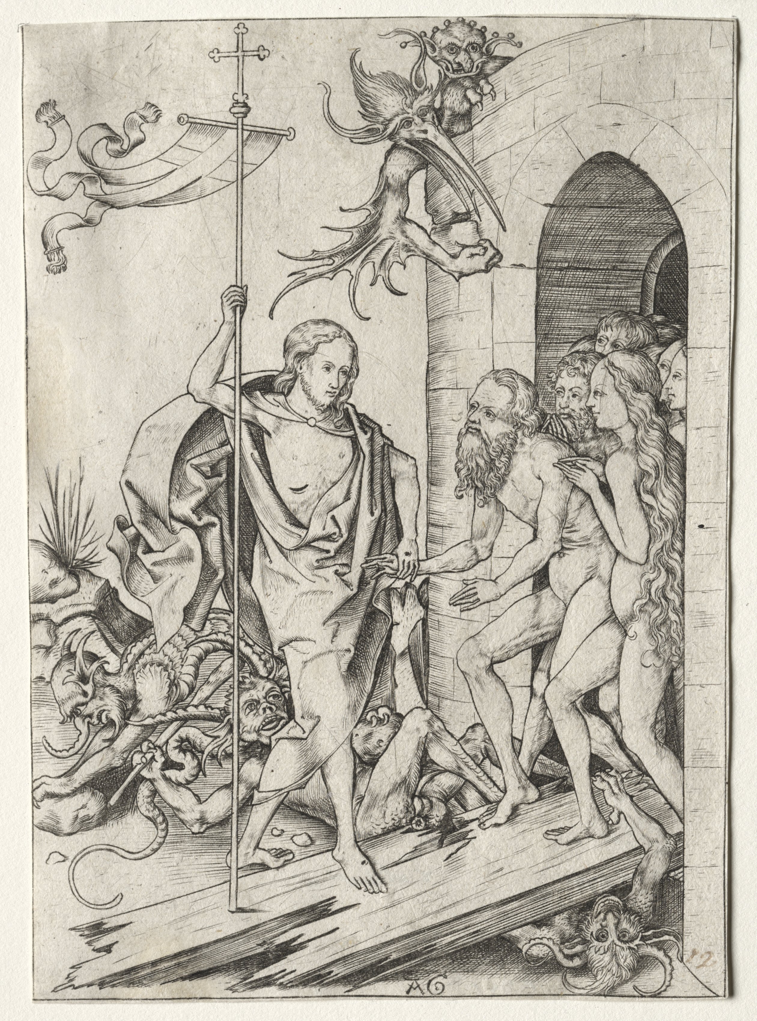 Black and white image. Depicts a man in a short robe holding a flag staff with cross on top. The man has a cape on his back. The man standing on a ledge or platform with an archway to the right. The archway has stone walls and several nude people are on the platform. The people are various ages; man with beard; woman with flowing hair; and children. The nude people are exiting the archway. There are grotesque creatures below the platform on the left. There is a winged creature flying in the air. The winged creature has large bird-like beak; pointy ears; skinny legs; and drapery on body. The winged creature is over the top center. The image conveys movement. The man with flag staff leads the group. The group exits dark passageway. The sky background on left. The image on aged paper with light brown color.