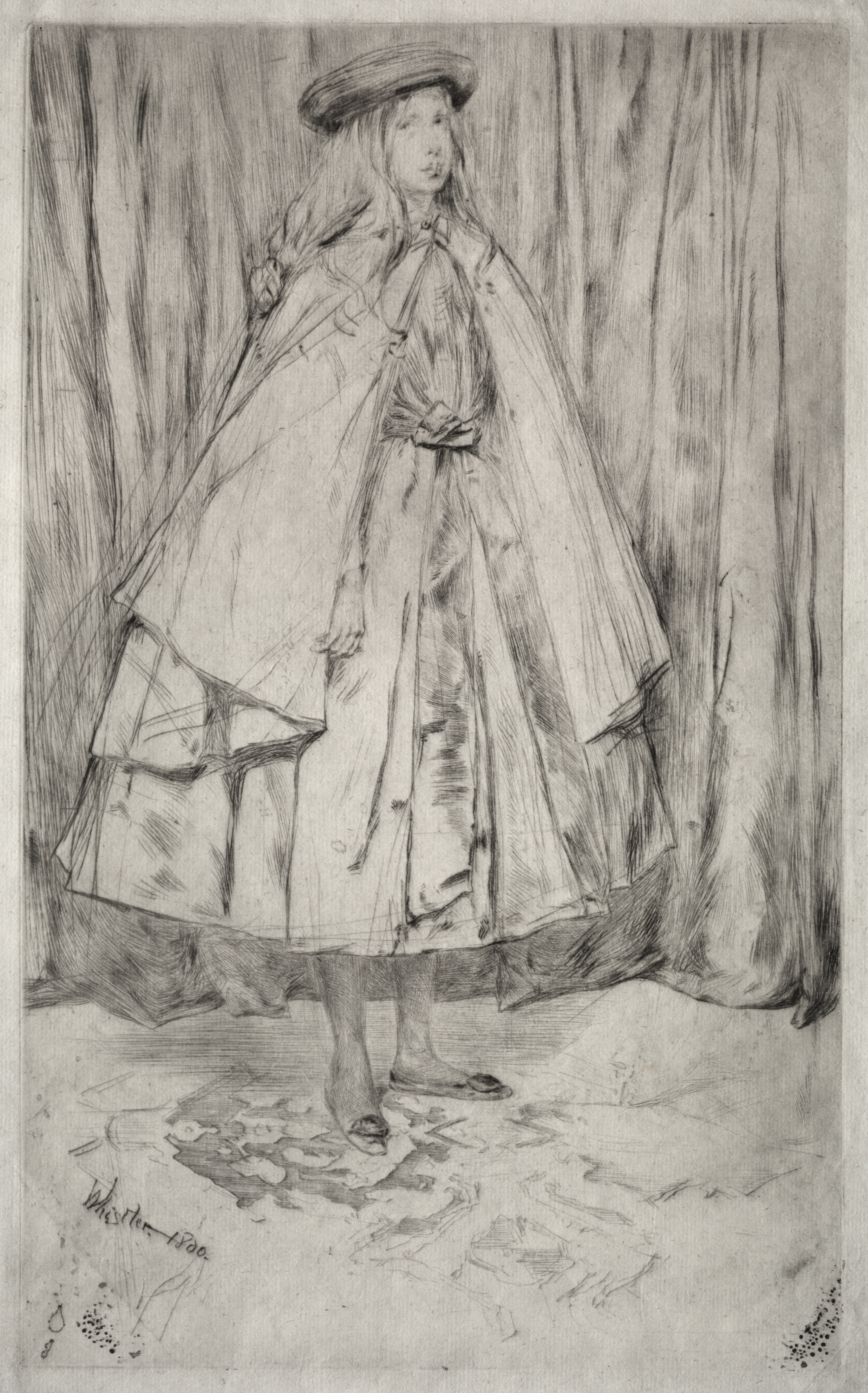 Black and white drawing of a girl in a dress and coat. The girl is standing, looking to her right. She has long hair and wears a hat. Her coat is open, revealing a dress. She wears shoes. The background appears to be curtains. The artist's signature is in the bottom-left corner.