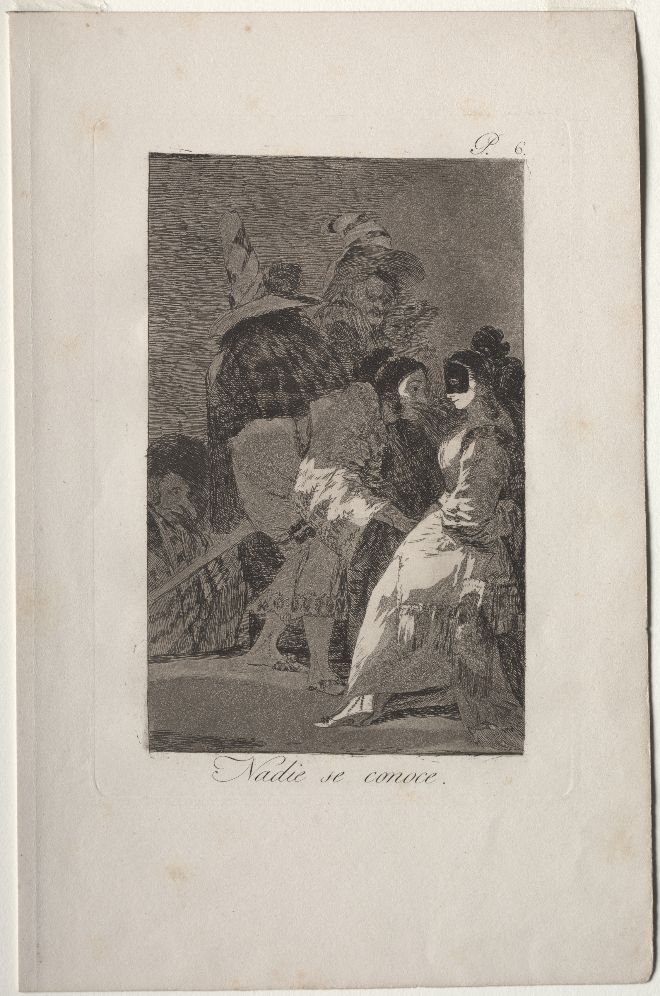 Black and white image of an etching on aged paper; rectangular with darker rectangular depression in center; etching depicts two people; woman in dress on the right sitting; man on the left standing; man wearing poncho; man and woman looking at one another; writing in cursive at bottom; 'P.6' in upper right corner; blank off-white border. No One Knows Himself, Plate 6 by Francisco de Goya.