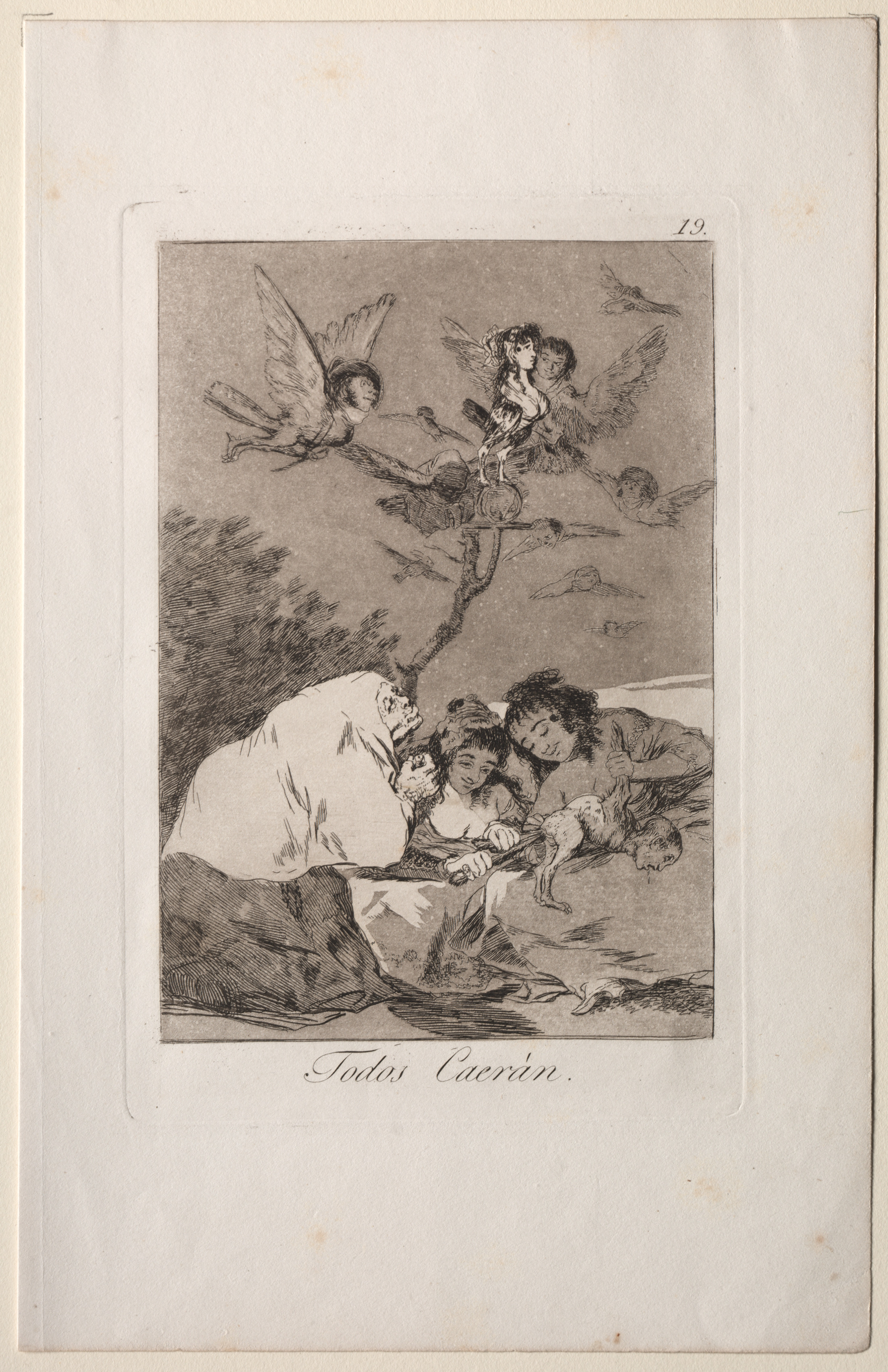 Black and white drawing of a man leaning towards two children on the ground. The man wears a white robe. One child holds a dead goat. Two angels are flying above them on a tree branch with another angel embracing them. The background features trees and a sky with birds. The scene depicts a dark and ominous mood. Text at the bottom reads "Todos Caeran".