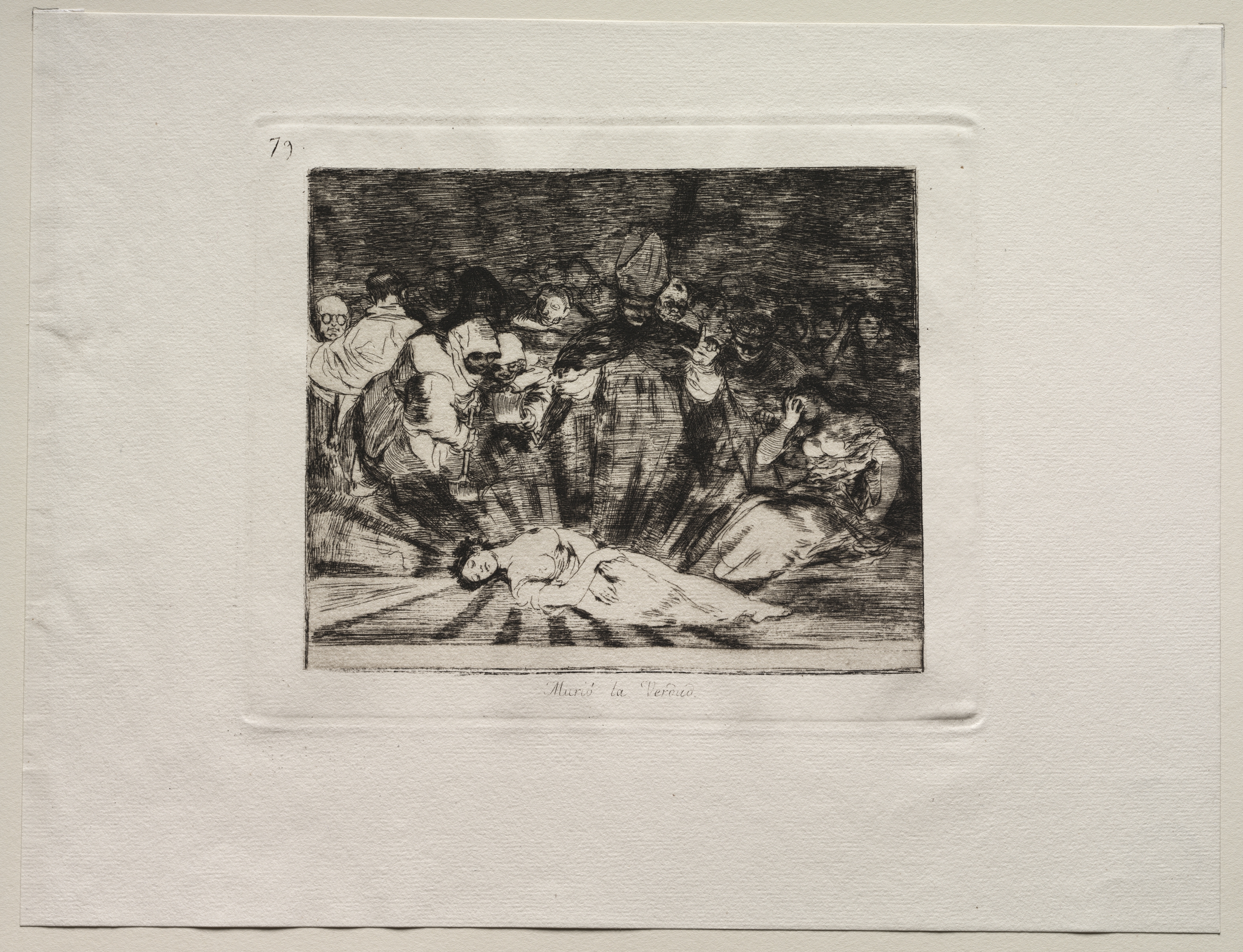 Black and white artwork with a thick off-white border. The artwork depicts a scene with a central figure lying on the ground, surrounded by multiple other figures. The central figure is a woman with dark hair wearing a long dress, lying on her back with her eyes closed and her left arm bent at the elbow. Her head is tilted to the left. The surrounding figures are variously dressed and some have their faces visible while others do not. One figure on the left appears to be elderly with glasses. A figure on the right sits with their head in their hand. The background appears to be dark and shaded with no distinct features. The text "Murió la Verdad" is written at the bottom of the artwork.