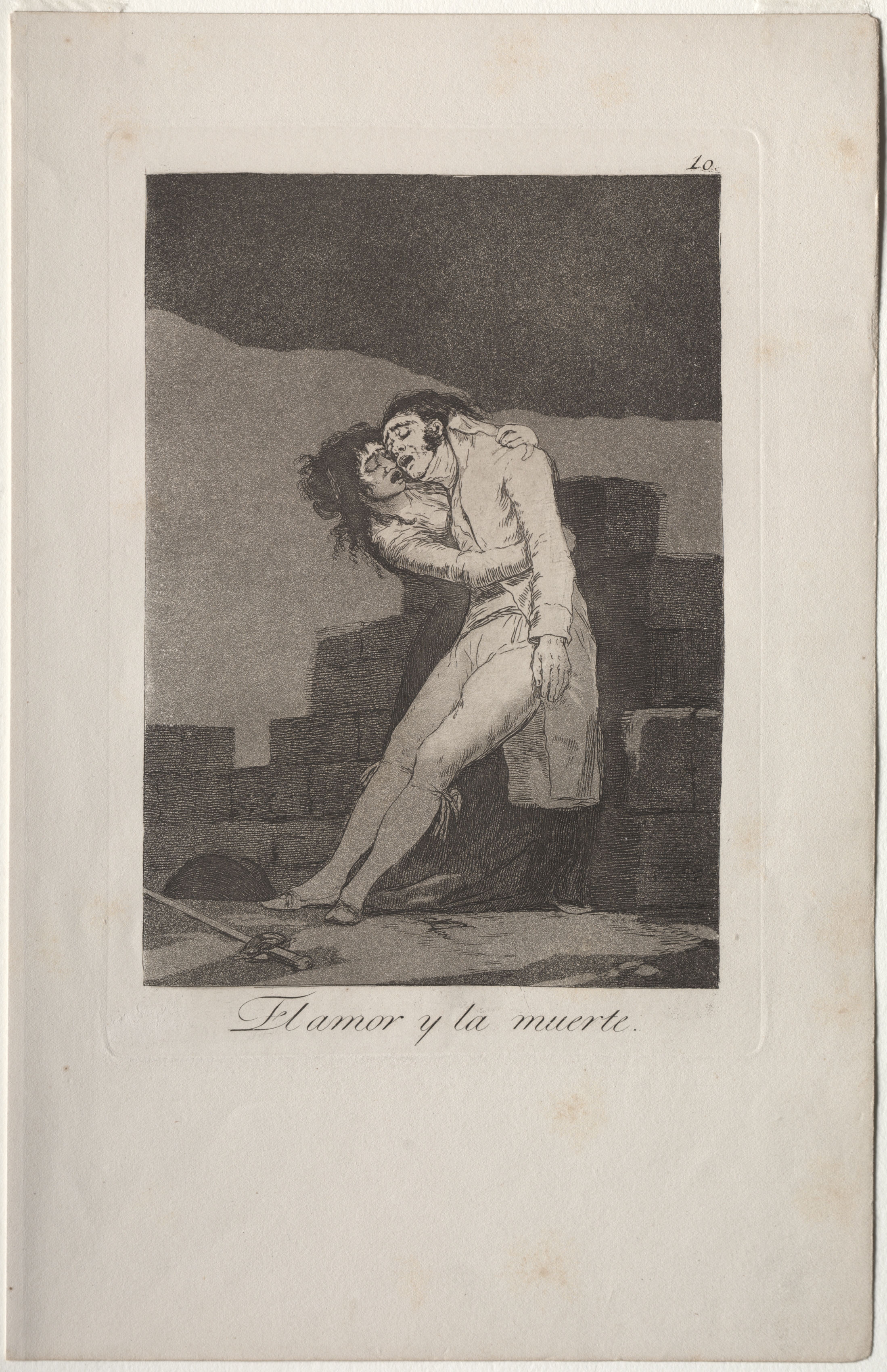 Black and white drawing of two naked people embracing. The embracing person on the right has their arms wrapped around the other person's body, holding their head against their chest. The person's body on the left is limp with their head tilted back. The embracing person on the right looks at the other person's face with their mouth open. A sword with a large handle lies on the ground beside them. They are standing on a stone floor in front of stone steps. A text at the bottom of the drawing reads "El amor y la muerte".