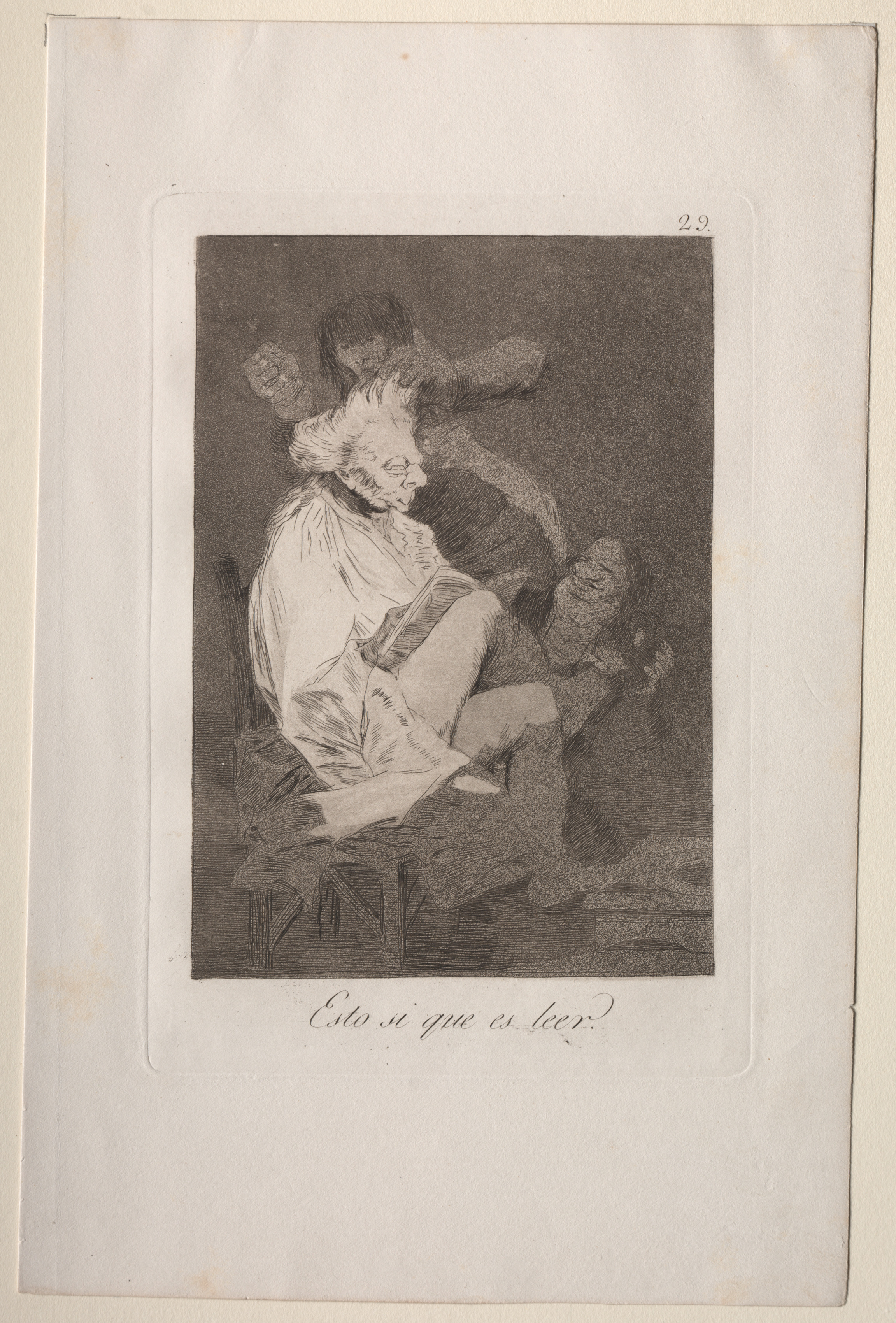 Black and white etching of a man reading a book sitting on a chair with another figure behind him. The man sits on a chair with a curved back wearing a white shirt with billowy sleeves, and his hair is unkempt and blowing up. The man holds a book with both hands in his lap, and his head is tilted down to read. Behind him, a figure wearing a dark garment appears to have their arms raised. The image is on a white background with a darker border around the etching. The plate number 29 is in the top right corner of the image. The text under the image reads "Esto si que es leer" which translates to "That certainly is being able to read".