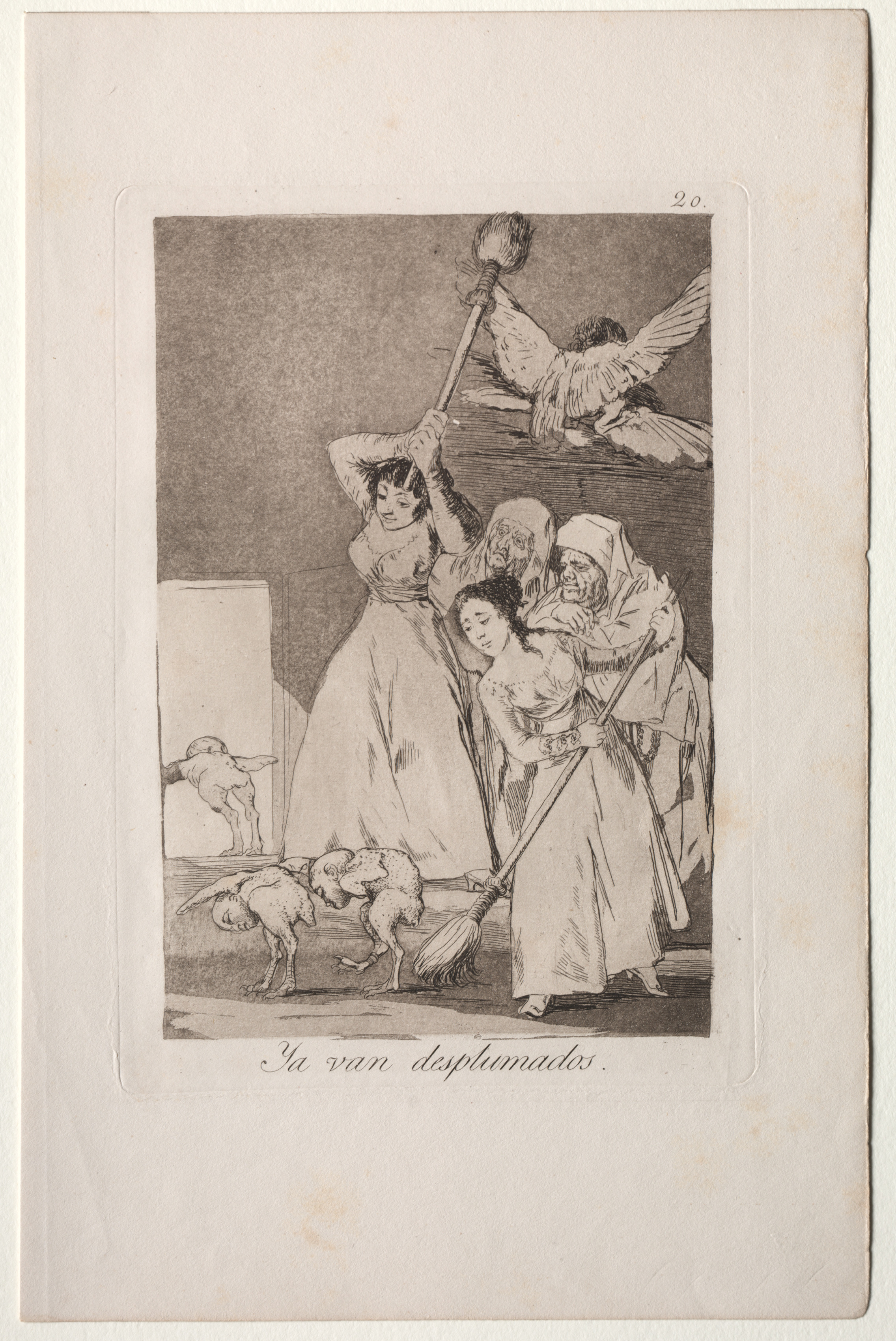 Black and white drawing of three women and three chickens. The woman on the left is wearing a dress and a head covering and holds a broom with a large flame on the end. She appears to have just thrown a chicken which is flying through the air. Two chickens are on the ground; one is dead. The woman in the center wears a dress. She holds a broom. The woman on the right appears to be old. She wears a head covering and holds onto the center woman. Her face is next to the center woman's face. There is a cherub on the background left. The image has a border. Text underneath the drawing reads "Ya van desplumadas".