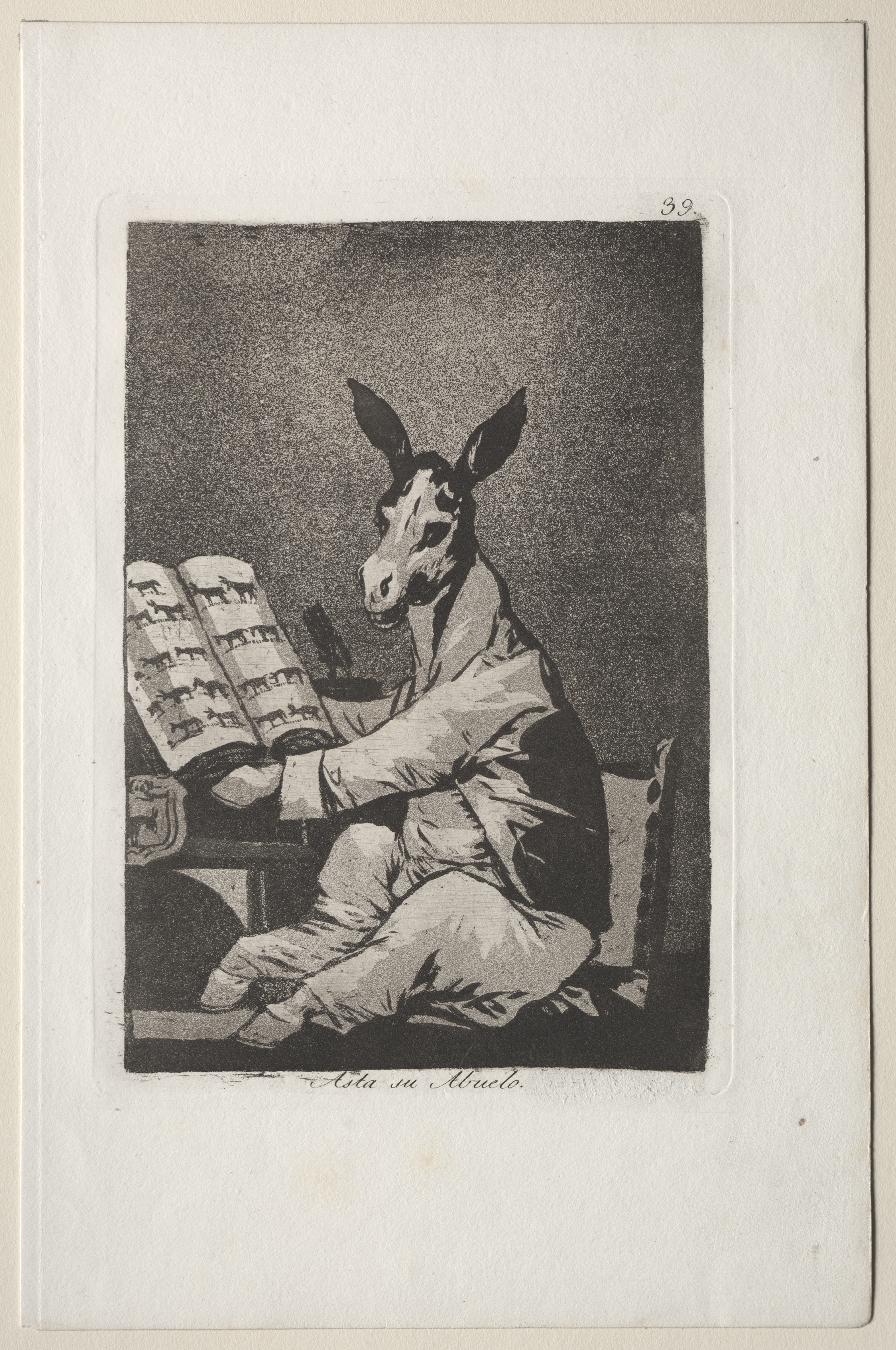 Black and white illustration of a donkey wearing a white shirt and pants sitting on a chair reading a book. The donkey has large ears pointed upwards. The book has pictures of donkeys on the pages. The donkey sits on a chair beside a table. The background is shaded darker behind the donkey. Small cursive writing is at the bottom. A number "39" is in the top right corner.
