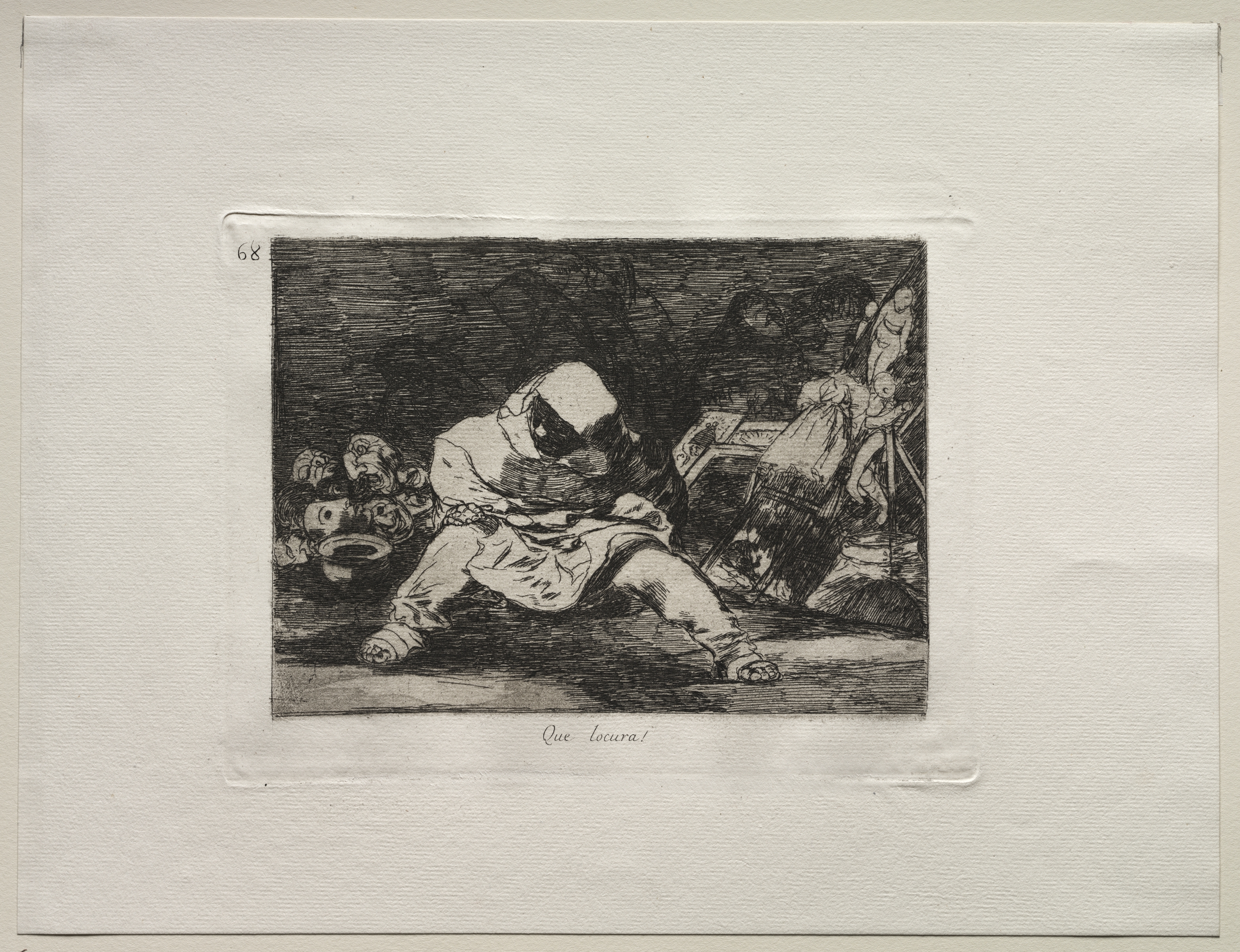 Black and white artwork depicting a man wearing a head covering sits on the ground with head down. The man wears a long-sleeved shirt and pants. His body language appears to be sorrowful or despairing. He sits on ground with one leg bent in front of him and the other behind. His hands are clasped in front of him. Behind him on the right is another figure on a ladder reaching toward a figure on top. On the left behind him are two heads. The background is dark. The artwork sits on a light-colored background. There is a small number in the upper left corner of the artwork and a phrase written in cursive at the bottom center.