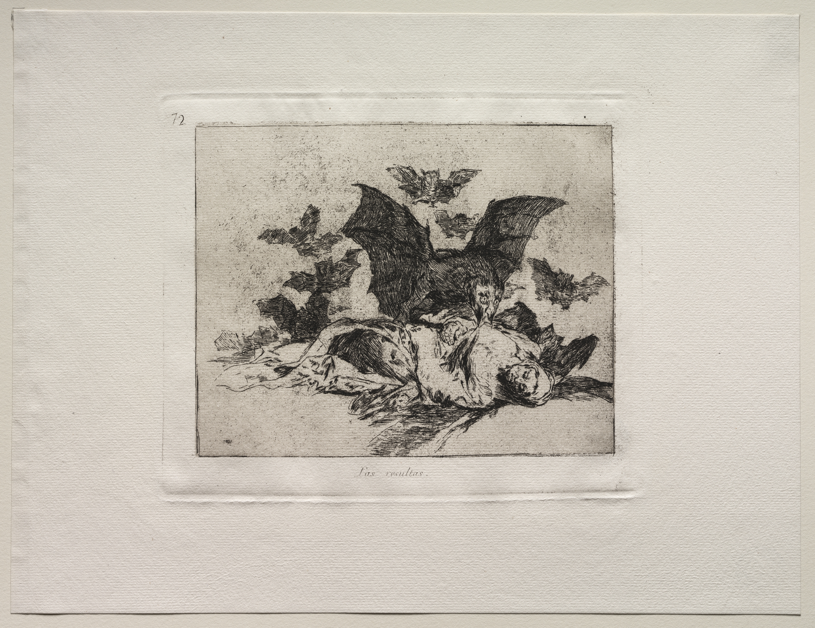 Black and white etching of a man lying on the ground on his back with his right arm across his chest and left arm and leg extended. He has a grimace on his face and his body appears emaciated. A large bat-like creature flies above him, while two other similar creatures sit on his body. The man has no clothes on and the scene is framed with a tree to his left and what appears to be bushes behind the creatures. A caption below the scene reads "The Consequences".