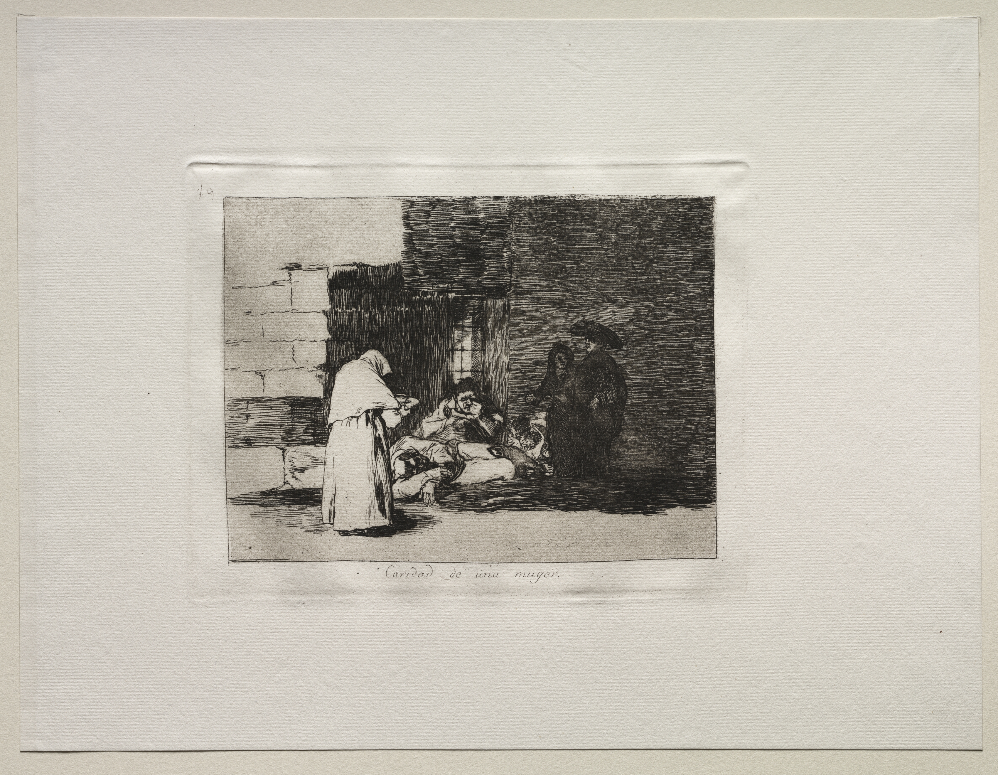 Black and white image of a woman in a long robe and headscarf standing over a person lying on the ground. The standing woman is holding a plate or bowl. There is a person standing to the right in a dark robe and a hat. The background includes a brick wall on the right. The image is in a white border. The image is titled "Caridad de una mujer".