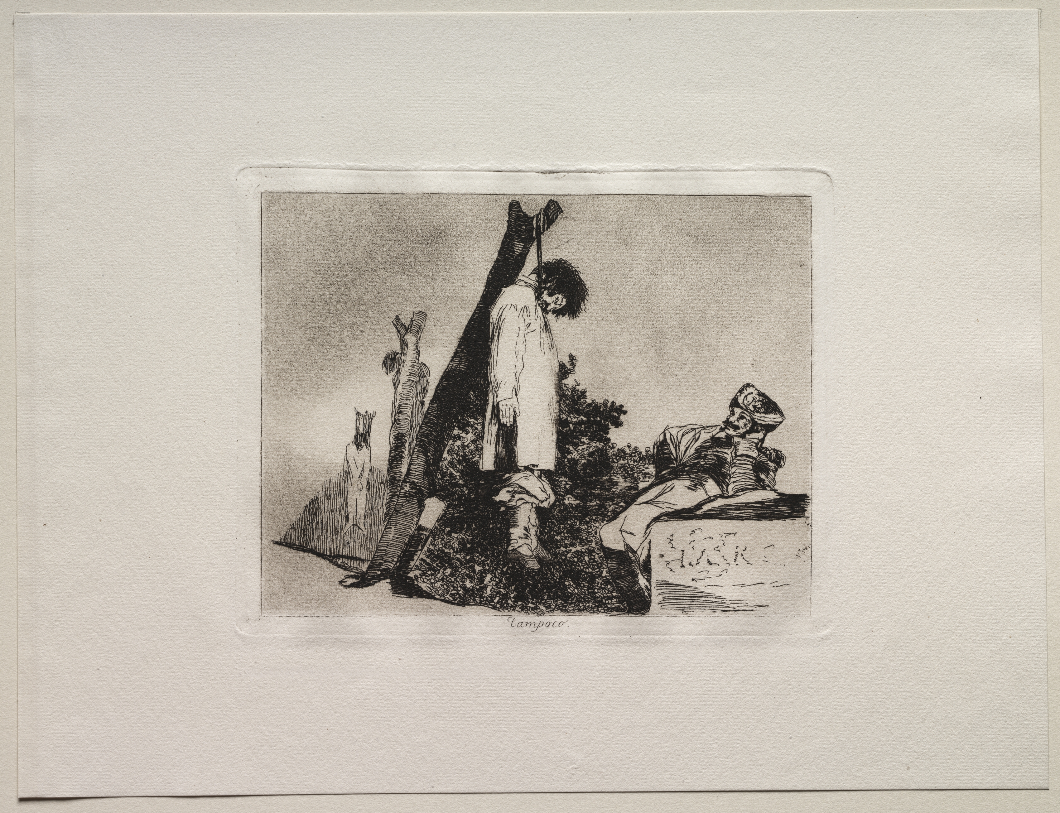 Black and white drawing of two men, one hanging from a post with rope around his neck and the other lying on a box to the right. The standing man wears a white robe. The man on the box has his head resting on his left arm and appears to be wearing a uniform hat. The object the man on the right is lying on has writing on it. There are trees and foliage behind them. The image is set against a light-colored background.