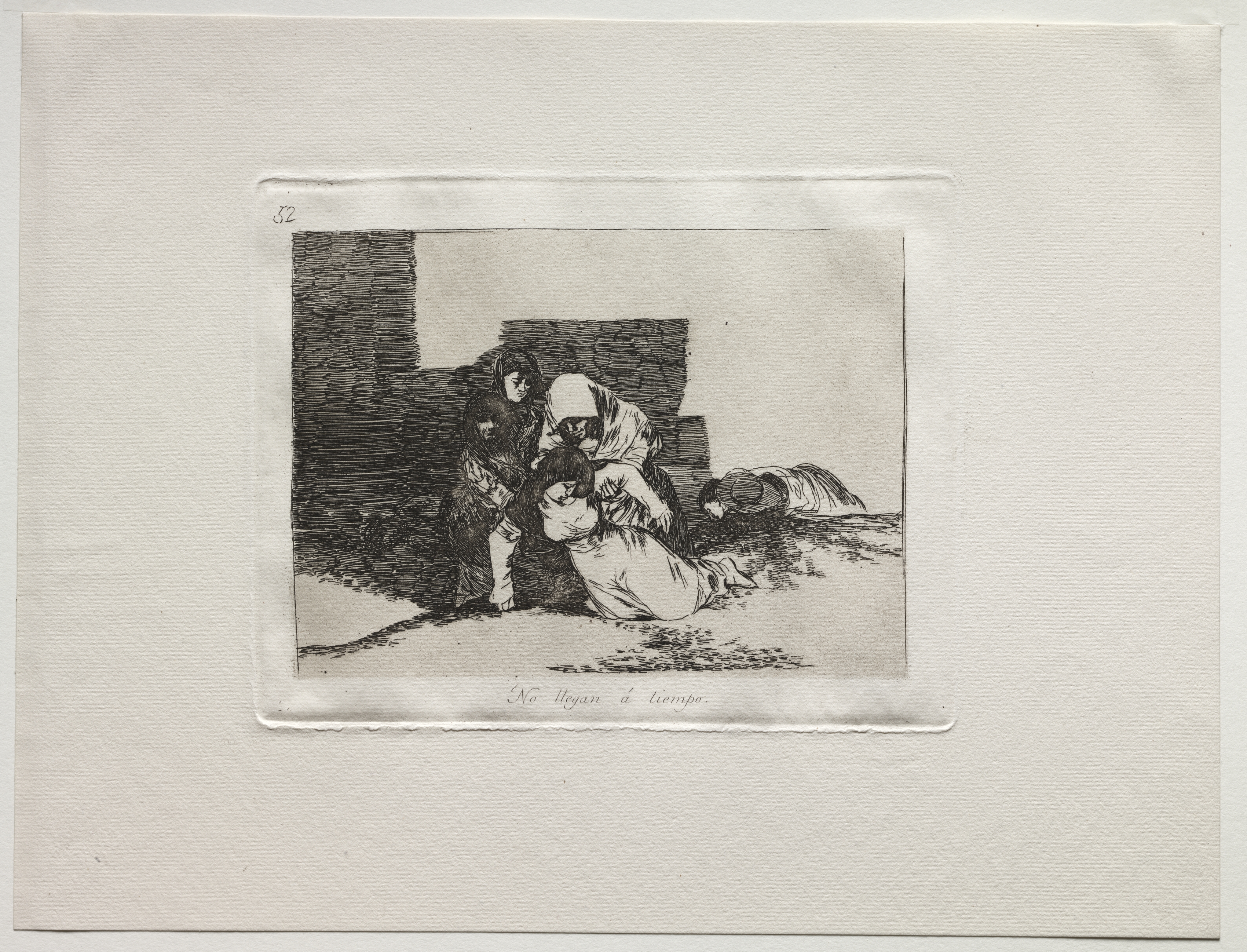 Black and white print of a woman on the ground with her head on the ground. She wears a long dress with sleeves. A woman wearing a head covering bends over her. A second woman crouches on the left. A small child stands behind her, on the right. The background includes a partially visible wall on the left. The text at the bottom center of the image reads "No Llegan a tiempo". The image is on off-white paper.