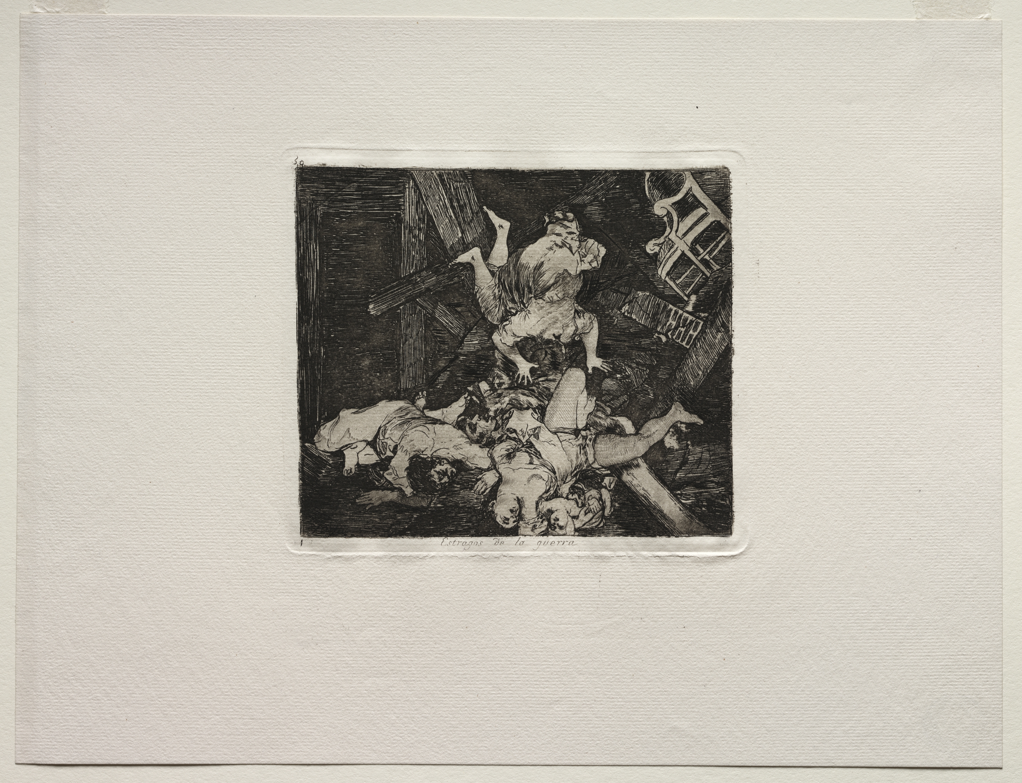 Black and white drawing of a chaotic scene. A woman wearing a long dress and with disheveled hair, appears to be on her knees. She has one leg bent and the other extended. Her arms are outstretched. She appears to be surrounded by the bodies of at least three people on the ground. To the right, the remains of a chair are visible. The background depicts a dark interior with beams. Small writing is visible along the bottom edge. The image has a thick off-white border.