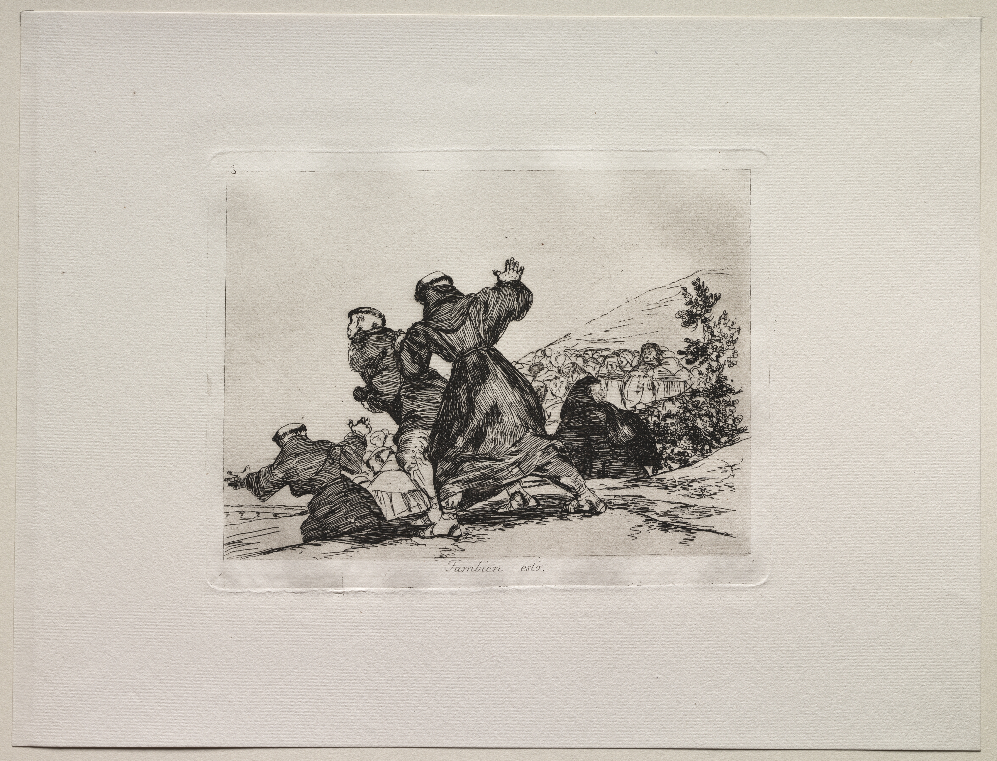 Black and white etching of a chaotic scene. A woman in a long dark dress is center, with her left arm raised and her body turned to the right. A man wearing a head covering is on the left. A woman with a light colored dress sits on the ground center. A dog is on the right. There are people in the background. The print has a white border. The print and border sit on a gray background.