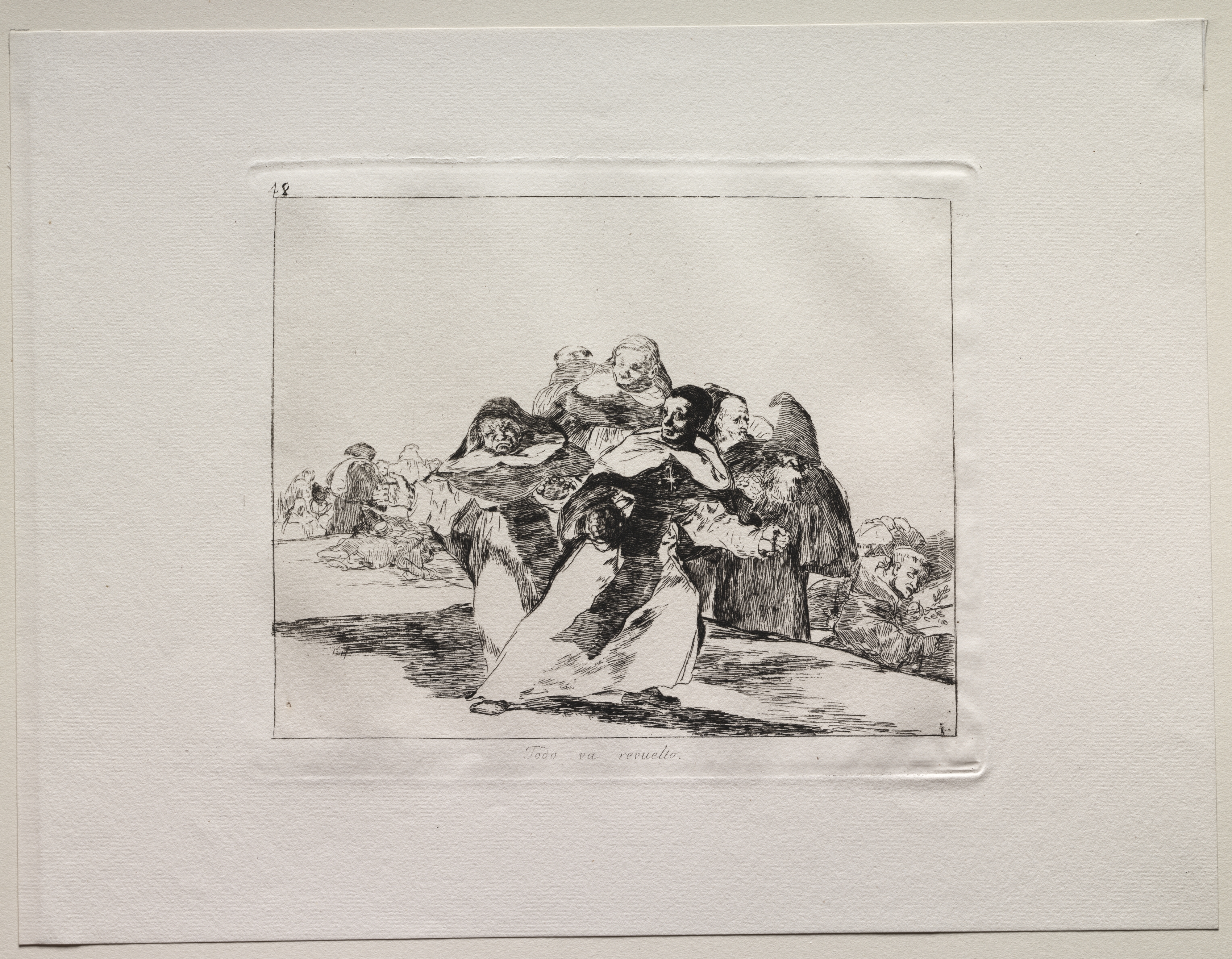 Black and white drawing of a chaotic scene. A group of people dressed in robes and head coverings are piled on top of each other. The people are distorted with bulging and misshapen bodies, some appear to have no heads. In the background, a hazy line of more people sitting and standing along the horizon. A caption written in cursive beneath the drawing reads "Todo va revuelto," which translates to "Everything is topsy-turvy." The drawing is set within a rectangular border on a white textured background.