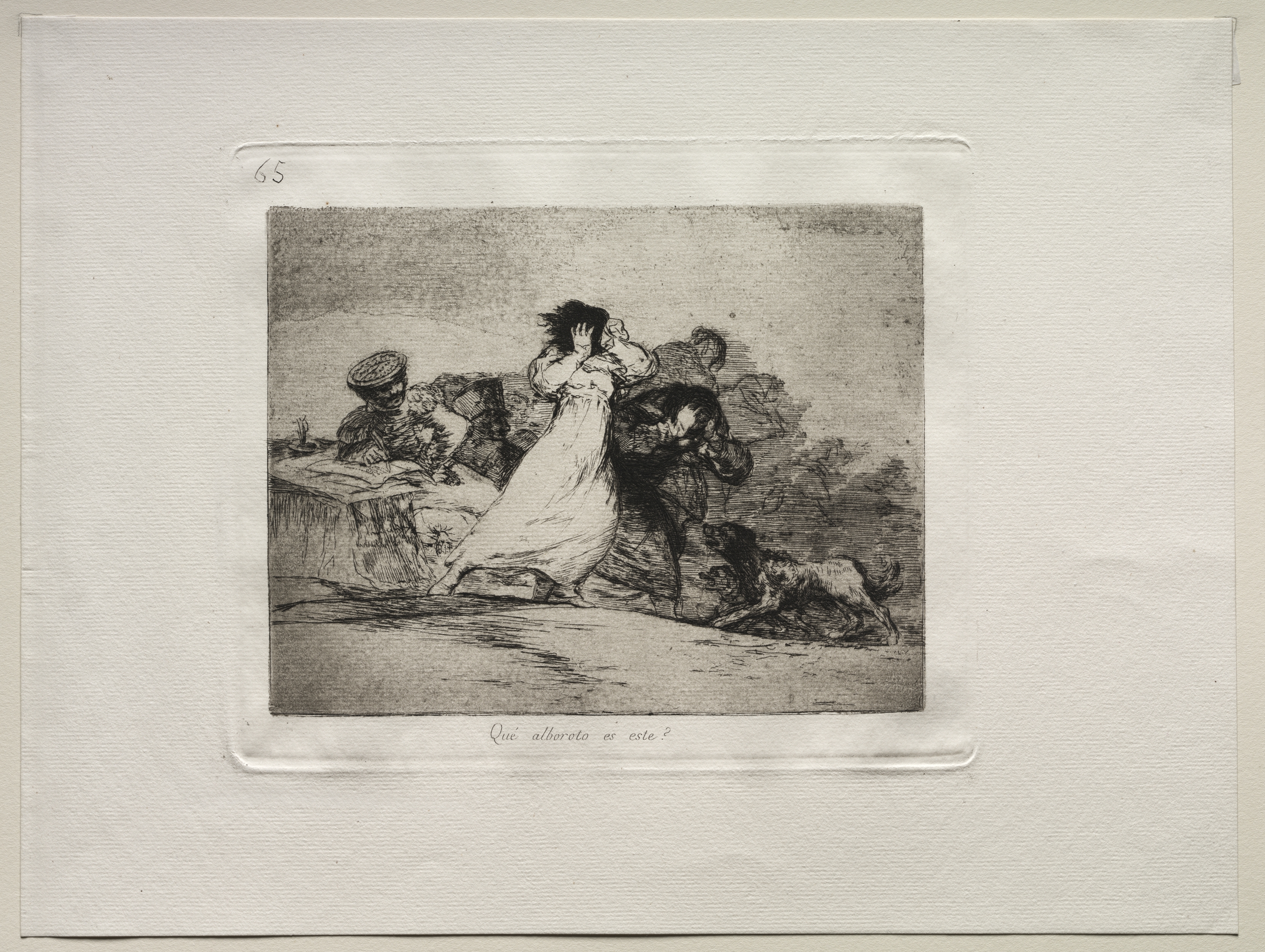 Black and white etching of a woman in a long, white dress and dark hair standing centrally, with her right arm raised to her head and her left arm extended downward. A dog is on the right side, facing left, biting a man who is on the ground. Two men are on the left side behind a low wall or barrier. The woman's dress flows behind her, and her hair appears disheveled. The man on the ground wears a hat and has his arms extended. One of the men behind the wall wears a hat and appears to be sitting. The scene is outdoors with minimal background detail. A caption at the bottom of the image reads "Que alboroto es este". The image is mounted on a white background with a slight shadow around the edges.