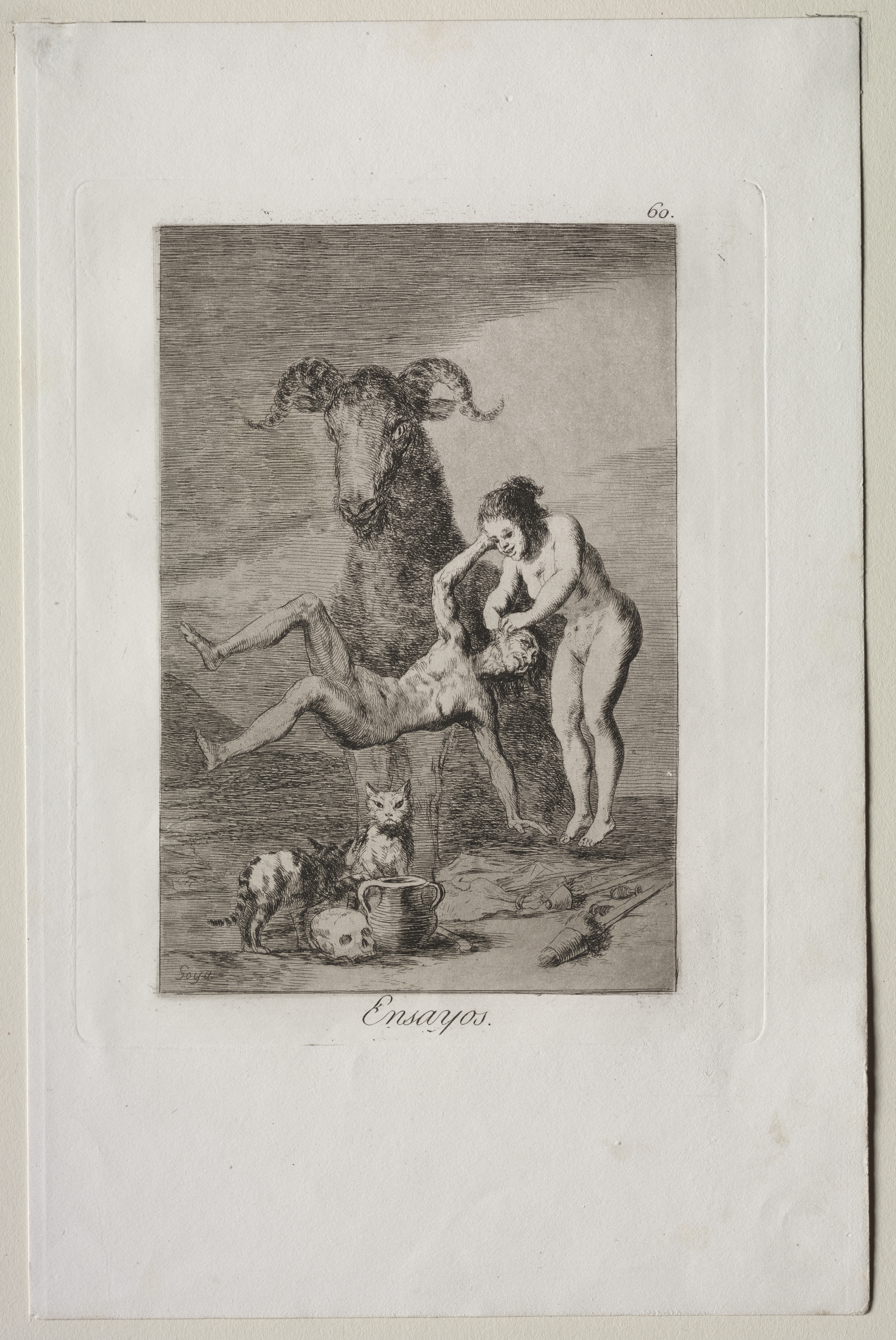 Black and white image of two nude men and a ram. The ram is standing on its hind legs with its head facing forward, and two curved horns protruding from its head. One man stands to the right of the ram with both arms around the ram's head and body. The man on the right has long dark hair and appears to be touching the face of the second man. The second man is on the left with one leg extended backward and the other bent, with both arms raised to the ram's body. The second man appears to have short dark hair. There is a cat to the left of the two men. The cat is standing and looking toward the viewer. To the right of the cat is a skull and a pot. To the right of the men is a fish or other sea creature. The image's background is shades of gray. The image has a white border around it and is labeled "Ensayos" at the bottom.