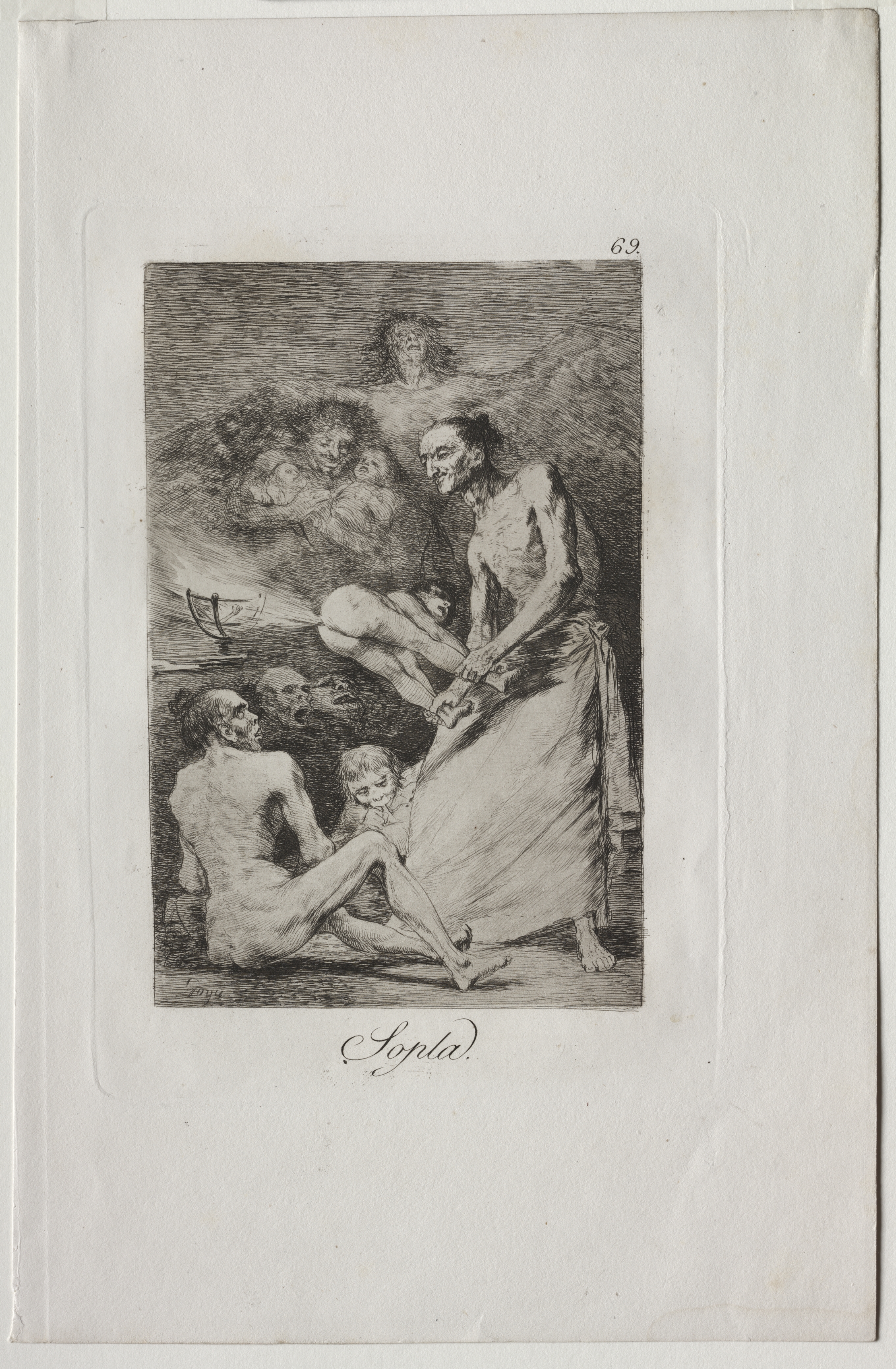 Black and white etching of a woman standing facing right and bending over a seated man facing left, she holds a large cloth in both hands. The man sits with his right leg bent and raised, and his left leg extended. A child sits on his lap. In the background, there are several ghostly human figures. The illustration is in a white border with the word "Sopla!" written in cursive at the bottom and the number "69" in the upper right corner. The image depicts "Blow, Plate 69" by Francisco de Goya.