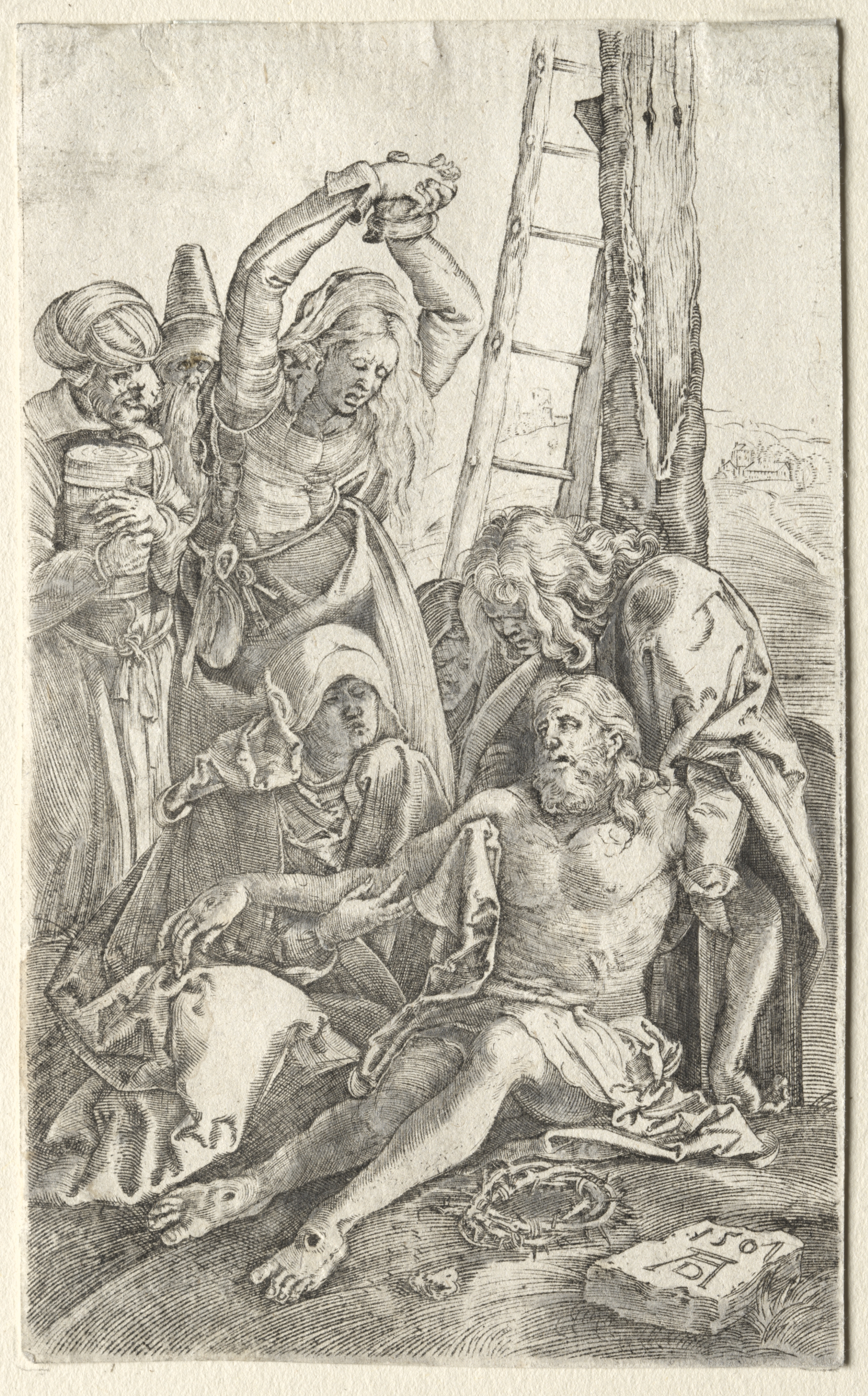 Black and white image of a group of people around a man lying on the ground. The man on the ground has long hair and a beard and has a cloth around his waist. He is lying on his back with his right arm bent at the elbow and his left arm extended. There are six people around him, some touching him. One woman in the middle has her arms raised. There is a ladder to the right and a tree trunk behind it. The people are dressed in old-fashioned clothes. The background shows a landscape with hills. There is a book in the foreground.