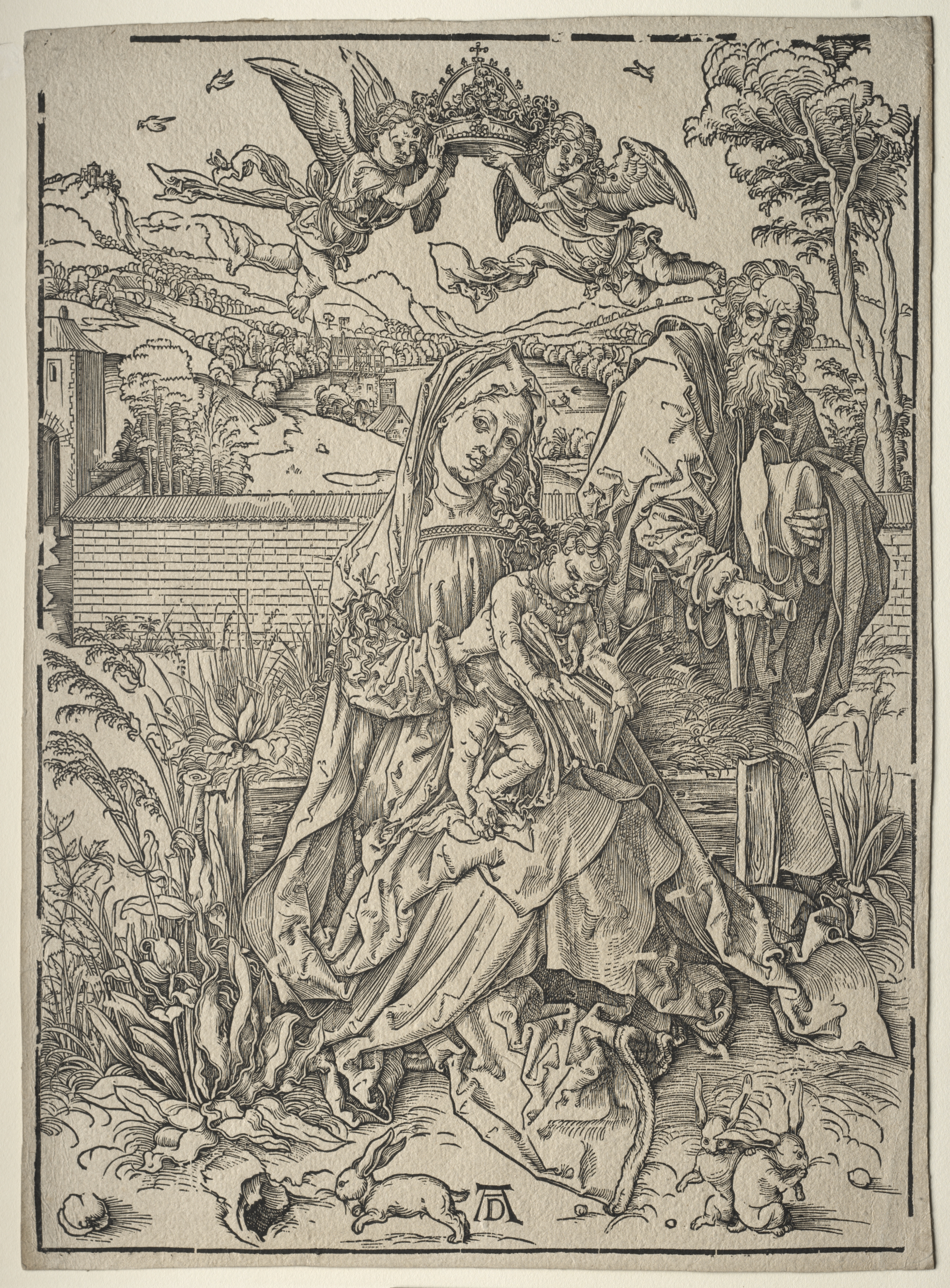 A black and white engraving of a scene depicting a holy family with three hares. The woman, wearing a long dress and head covering, sits on the left center, holding a baby. A man with a long beard, wearing a robe and cloak, stands to her right. He holds a staff in one hand and a cloth in the other. Three hares are depicted at the bottom center of the image. In the background, two angels fly above, holding a crown. A town and landscape are visible behind them. The scene is framed by a thin border.