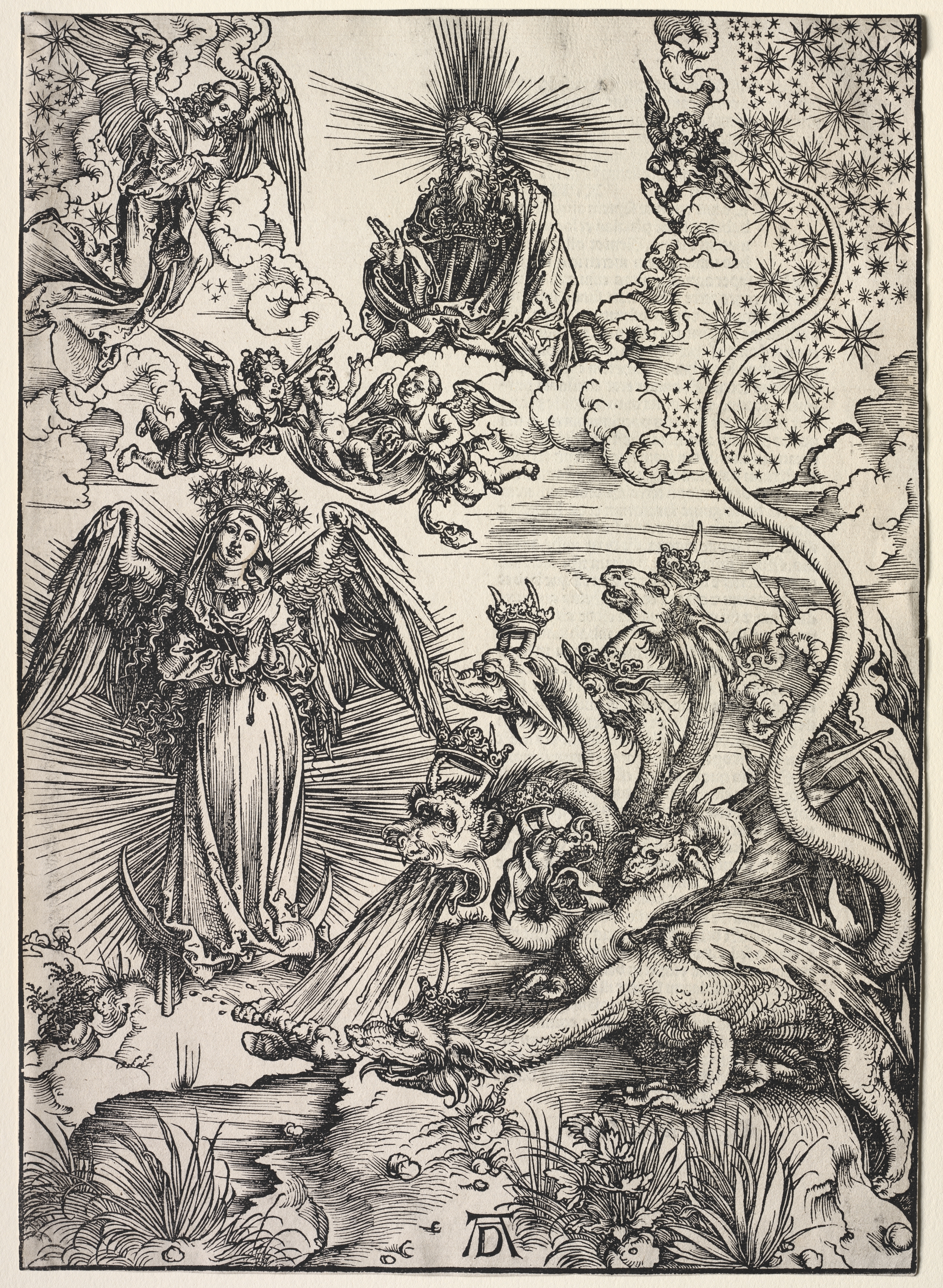 Black and white image. A woman wearing a long dress and a crown. She has wings and holds a child. She stands on a crescent moon. A man with a long beard sits on clouds. The man has a halo of lines around his head. There are cherubs on clouds below him. There are multiple angels. One angel plays a trumpet. There are seven headed dragon-like creatures with snakes for tails. The creatures have wings and are surrounded by clouds. There are plants on the ground. The background has stars. The drawing is highly detailed with many lines.