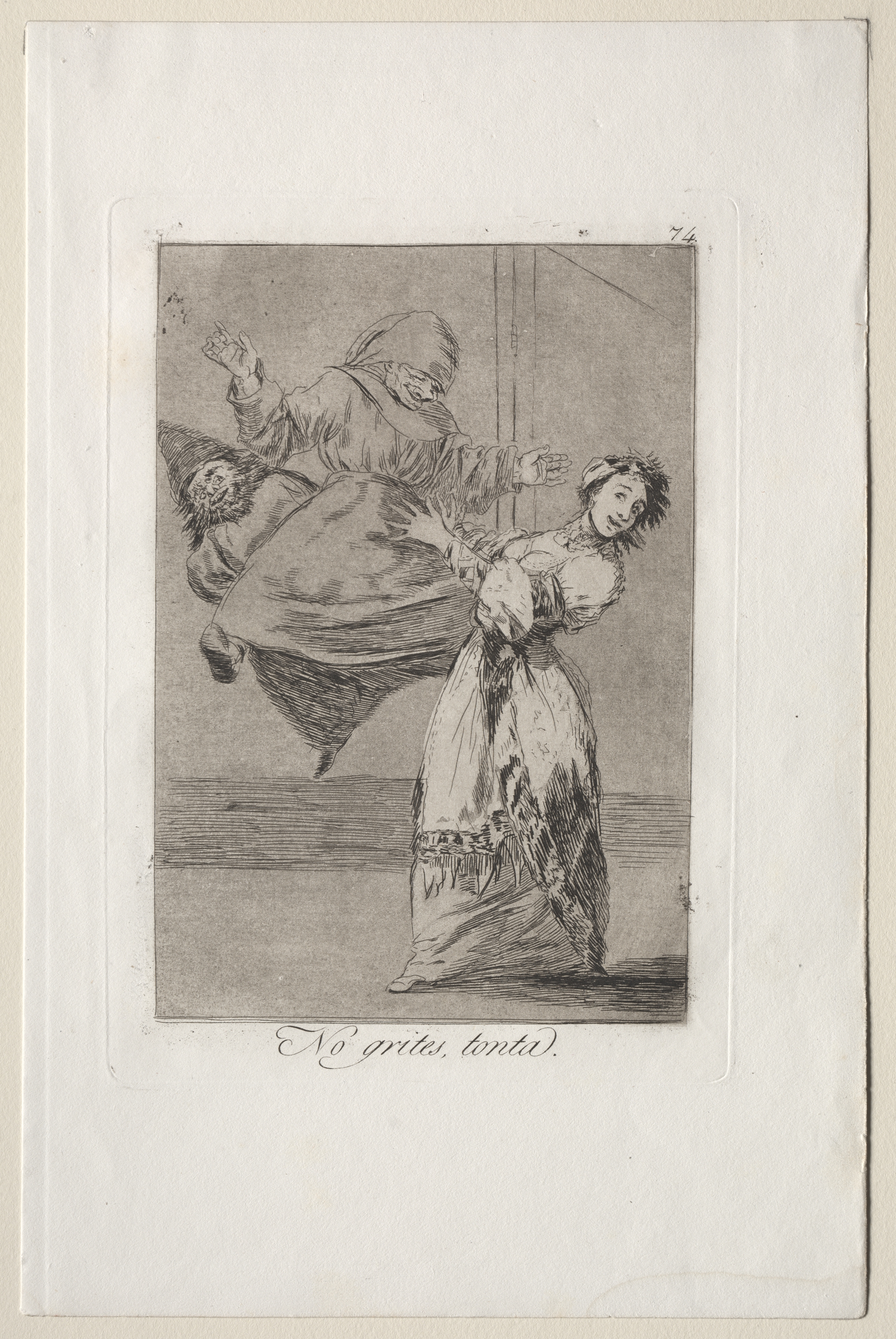 Black and white etching of two women. One woman wears a headscarf and a full long dress and appears to be jumping up and over the other. The woman on the ground wears a less full dress with puffy sleeves and a low neckline. Her right arm is bent at the elbow with the hand near her face. Her left arm is extended out to the side. She appears to be looking up. The headscarf of the other woman obscures most of her face, but she appears to be looking down. She has one leg tucked under her and the other extended behind her. Her left arm appears to be bent at the elbow near her waist and her right arm extended outward and upward. Spanish text appears in cursive at the bottom. The image appears on a piece of white paper with a slightly darker border.