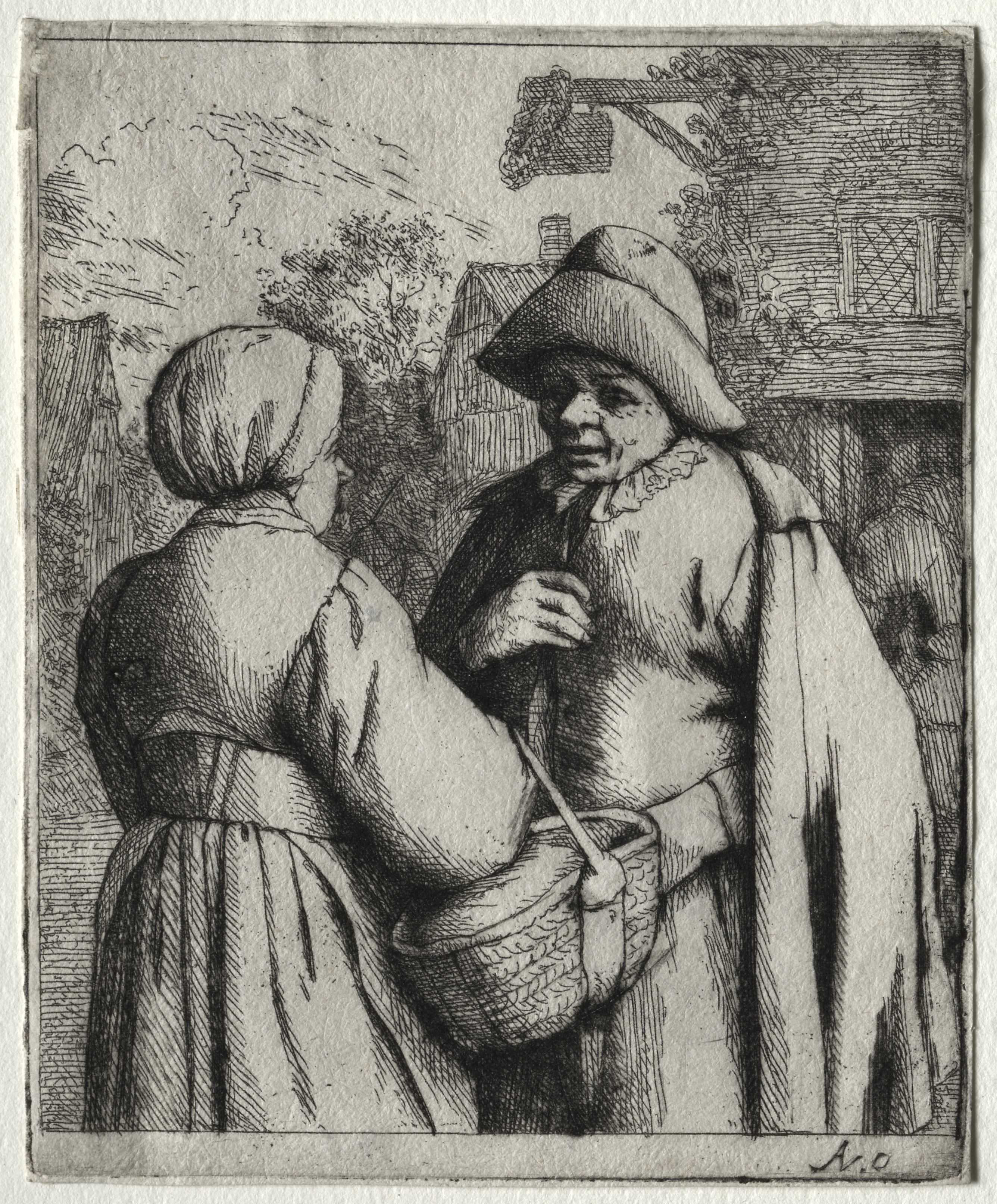 Black and white image. Two people standing outside. The woman on the left wears a dress and head covering, facing right. The man on the right wears a wide-brimmed hat, a cloak over a dress shirt and vest. He holds a long pipe in his left hand. The woman holds a basket in her left hand. A house behind them, with a fence and trees. The artist's initials "A.v.O" are in the lower right corner. Man and Woman Conversing by Adriaen van Ostade.