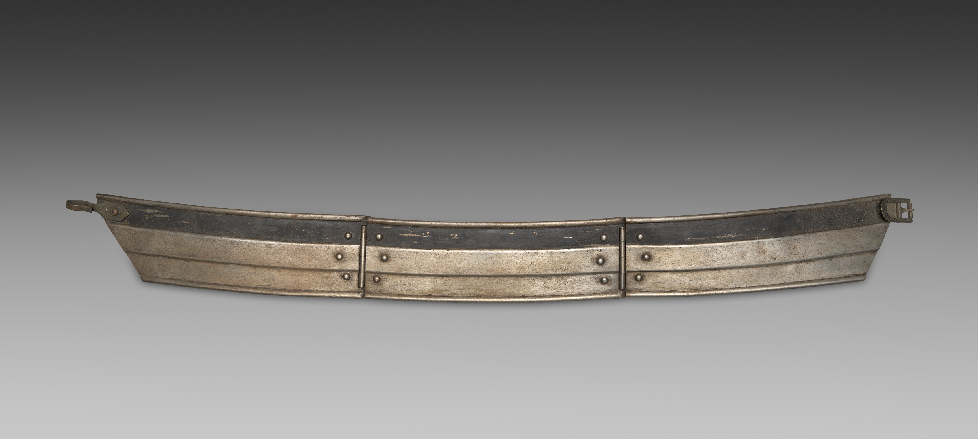 Armored Horse's Rein by unknown artist. Metal piece, curved with a slight upward bend. Made of metal with a dark patina and visible signs of wear. Two long, horizontal strips run along the top and bottom. Three sections fastened together with rivets. Left end has a short metal tab; right end features a small loop. Background transitions from dark gray at the top to light gray at the bottom.