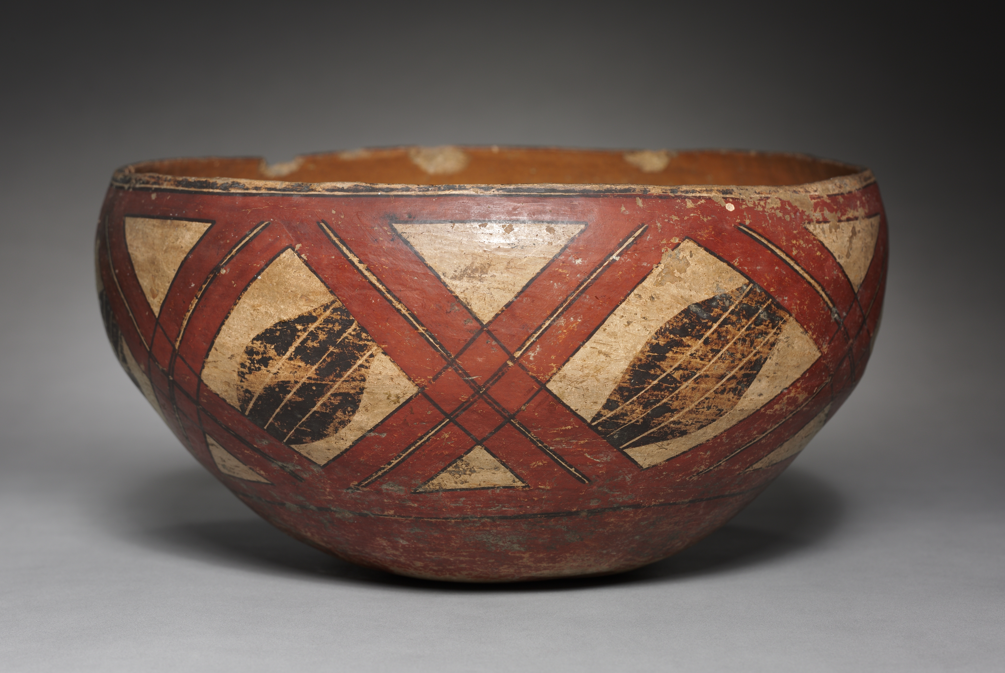 Stew Bowl by Native Artist, a large earthenware bowl with a wide mouth and rounded body. The bowl's exterior features a red and tan color scheme with black accents. Red lines form crisscrossing diamond shapes around the bowl's body. Tan sections are interspersed between the red lines, and two black oval shapes resembling leaves are visible on the front. The interior of the bowl is a light brown color with some darker spots. The background of the image is a gradient from dark gray at the top to light gray at the bottom. The bowl casts a shadow on the surface below it. The surface the bowl sits on appears to be a flat, light gray color.