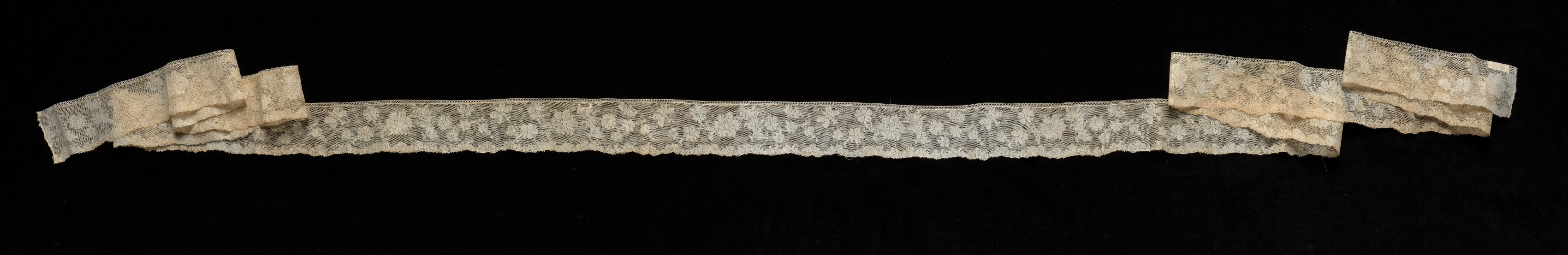 The image shows a long, narrow piece of bobbin lace edging by an unknown artist. The lace is beige with a floral pattern and has a wavy edge. It is stretched out horizontally across the center of the image. The lace is wider at the top than at the bottom. There are two folded sections on either end of the lace, which appear to be made of the same material as the lace. The background of the image is black.
