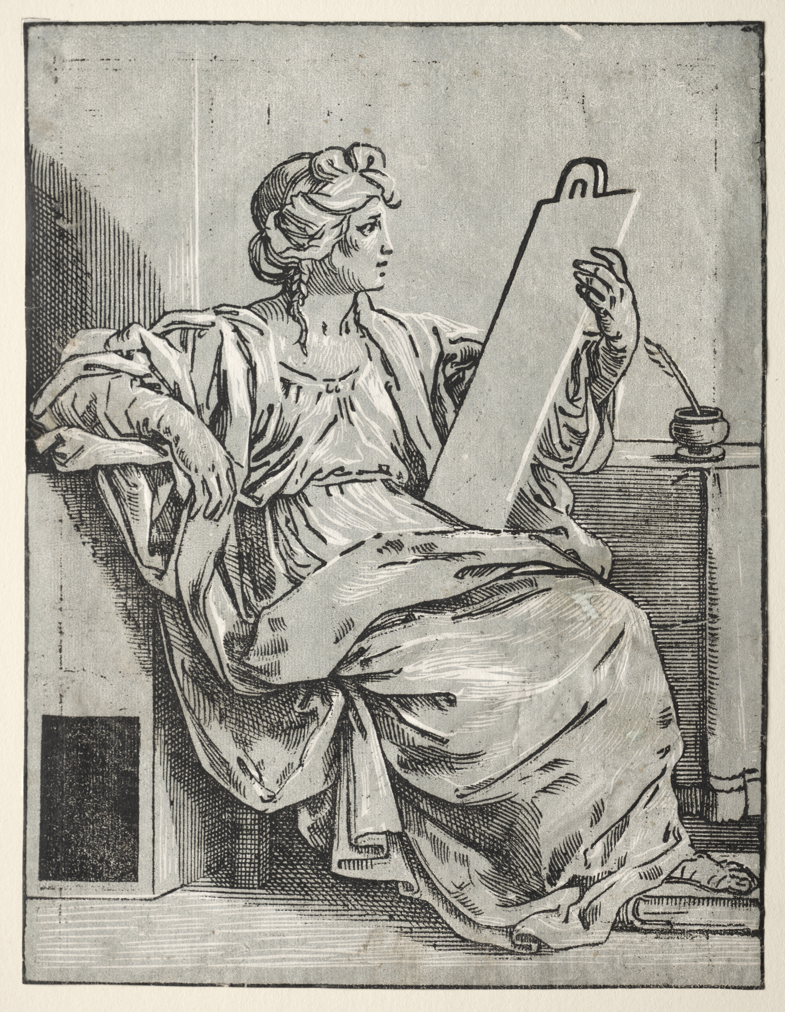 A woman wearing a long dress sits on a chair holding a large piece of parchment. The woman's hair is pulled back. She sits on a chair with her body facing left and her head turned to the right. The near arm rests on the arm of the chair, while the far hand holds the parchment. The chair sits in a corner with the wall on the left and a table on the right. The table holds a vessel with a stick. The image is in black and white.
