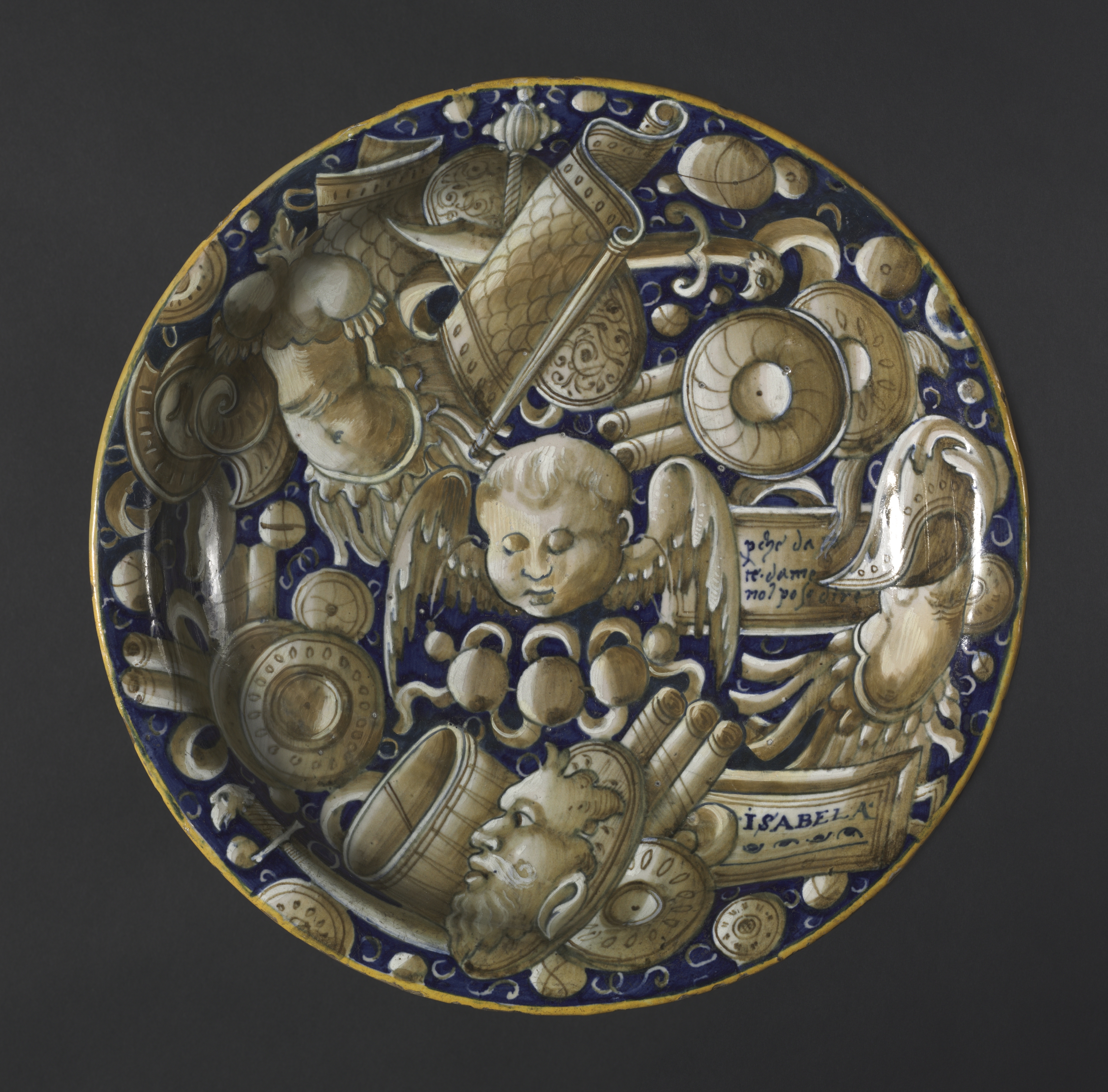 The Plate with Putto, Masques, and Trophies by Andrea della Robbia features a blue plate with a gold rim. The plate contains various objects, including a trumpet, a horn, a drum, a barrel, a masquerade mask, and a putto. There are two putti faces on the plate. One putto face is in the center. The other putto face is upside down and at the bottom. The plate also features several other items, such as a banner with the name "Isabella" and a collection of musical instruments and masks. The background of the plate is dark blue with gold accents.