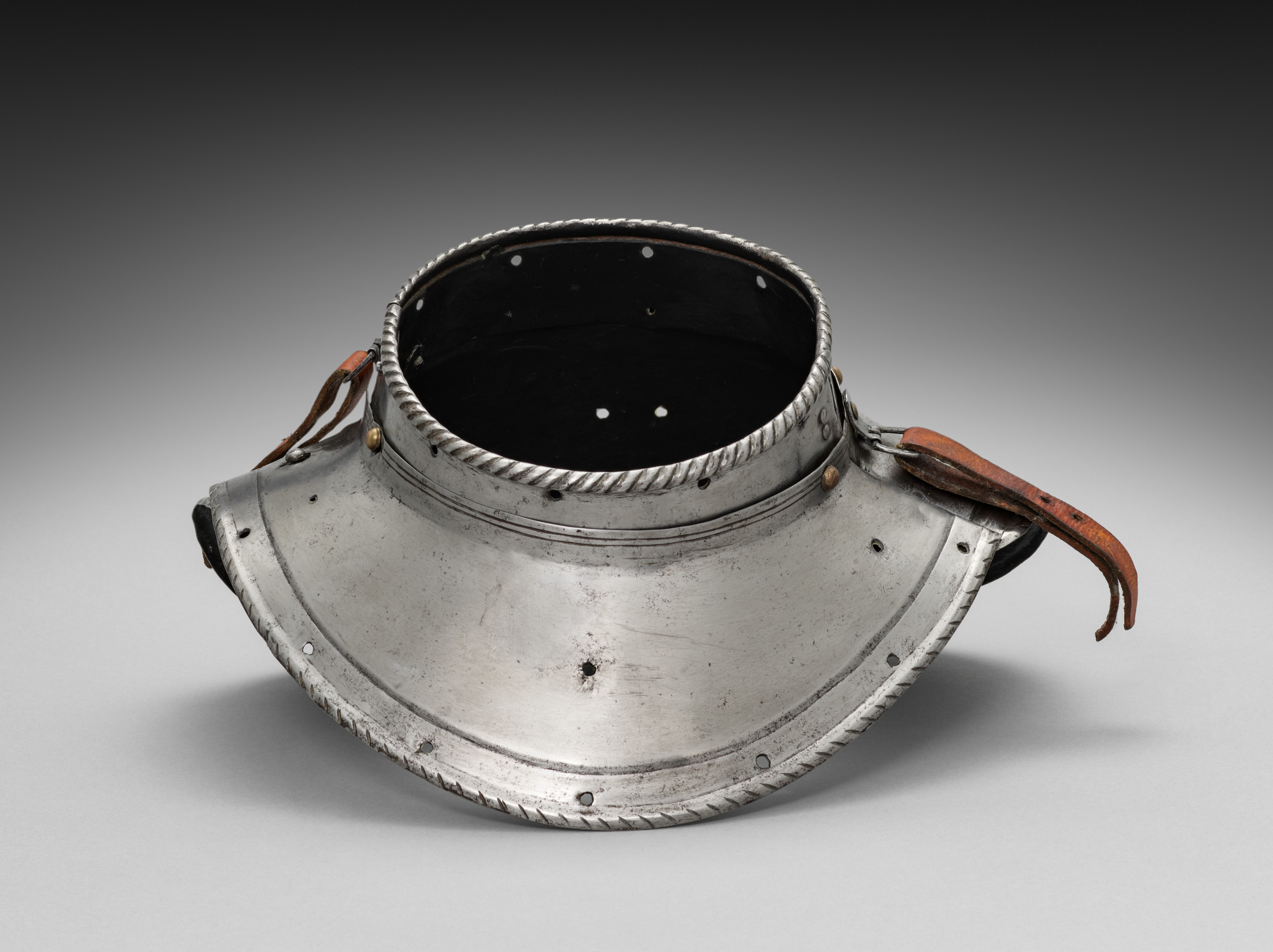 Colletin by Hans Stopler, a semi-circular piece of armor with a wide, curved shape that covers the neck and upper chest, made of silver metal with a rope-like design around the edges and rivets along the bottom edge; the inside is black with four visible holes; two brown leather straps attached on either side.