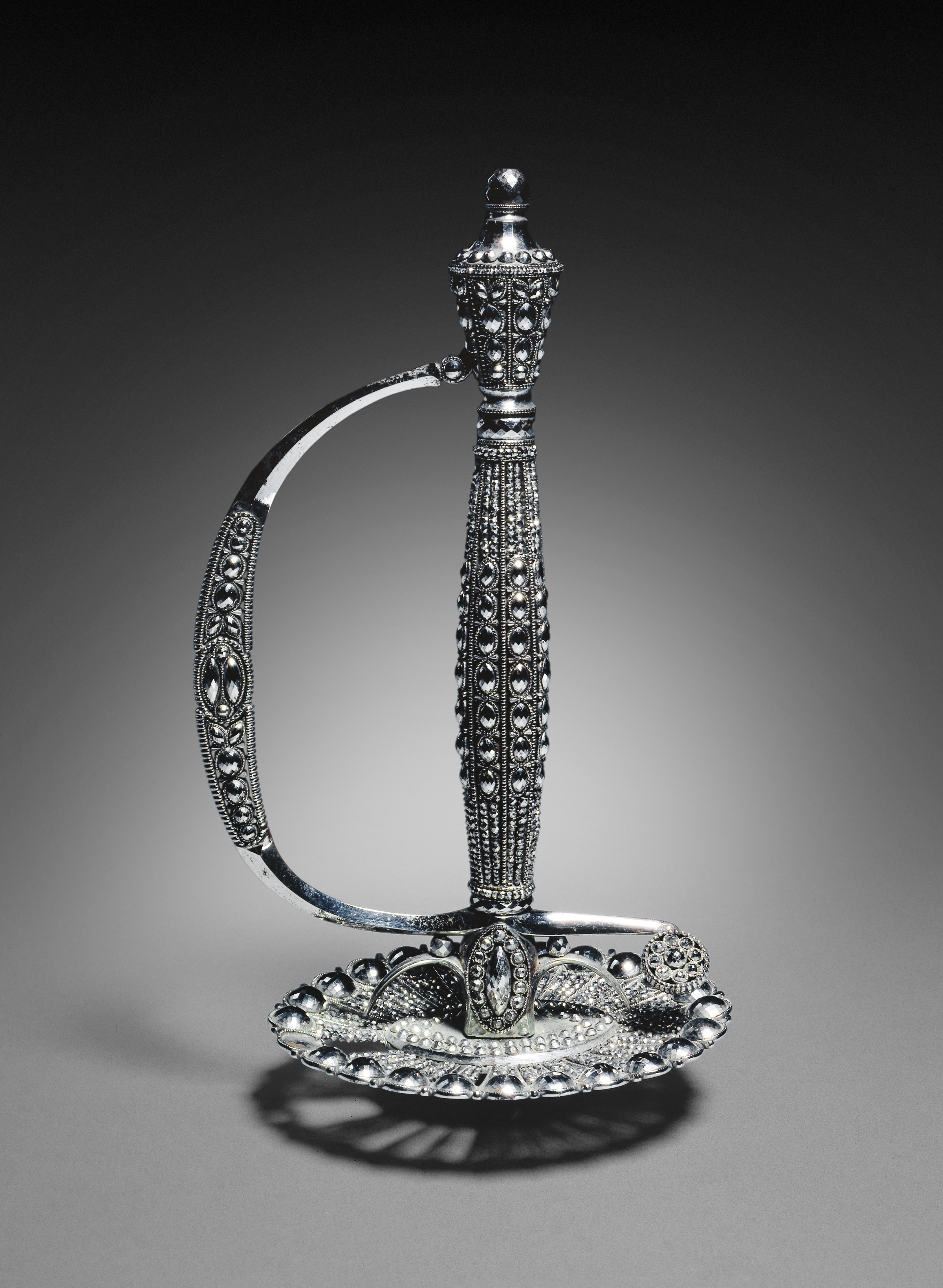 The object is a silver-colored metal hilt from a court sword. The hilt has a long, thin handle with an ornate design featuring various patterns and textures. The handle is topped with a small spherical finial. A curved metal piece, known as a knuckle guard, extends from the handle to protect the hand. The base of the hilt is decorated with a leaf-like design and features a beaded edge. The background of the image is a gradient of black to gray, with a light source coming from the center. The overall appearance is ornate and decorative, suggesting it was crafted for a high-ranking individual.
