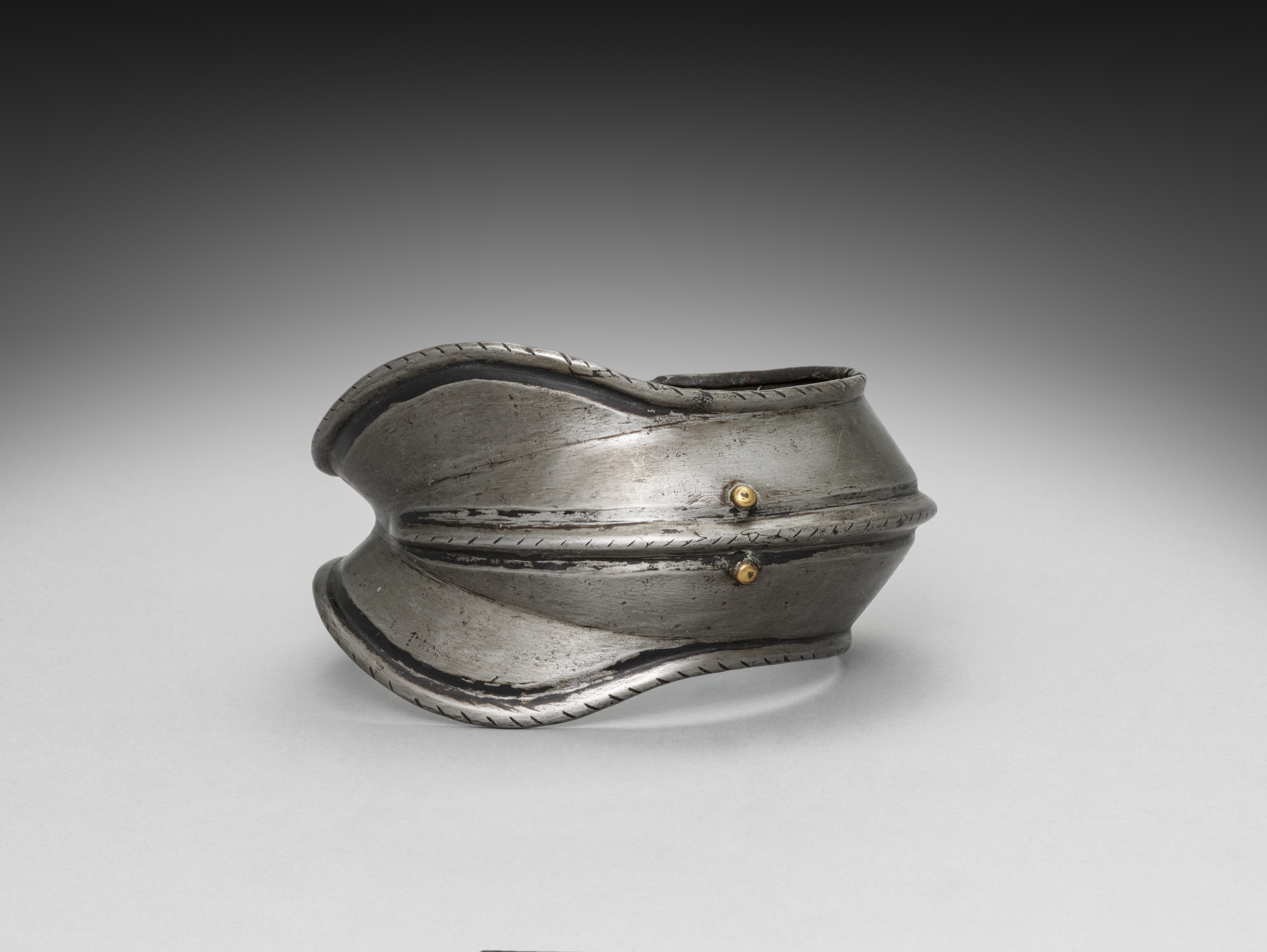 Metal object, likely a knee cap, made of silver or gray metal. The object has a wide, rounded rectangular shape with a hollow interior. Two horizontal lines encircle the object, one near the top and one around the middle. A decorative rope-like pattern adorns the top and bottom edges. Two small gold-colored rivets are positioned on the front, one on each line. The object sits on a white surface with a gray to black gradient background. The artist is unknown, but the title of the piece is "Knee Cap".