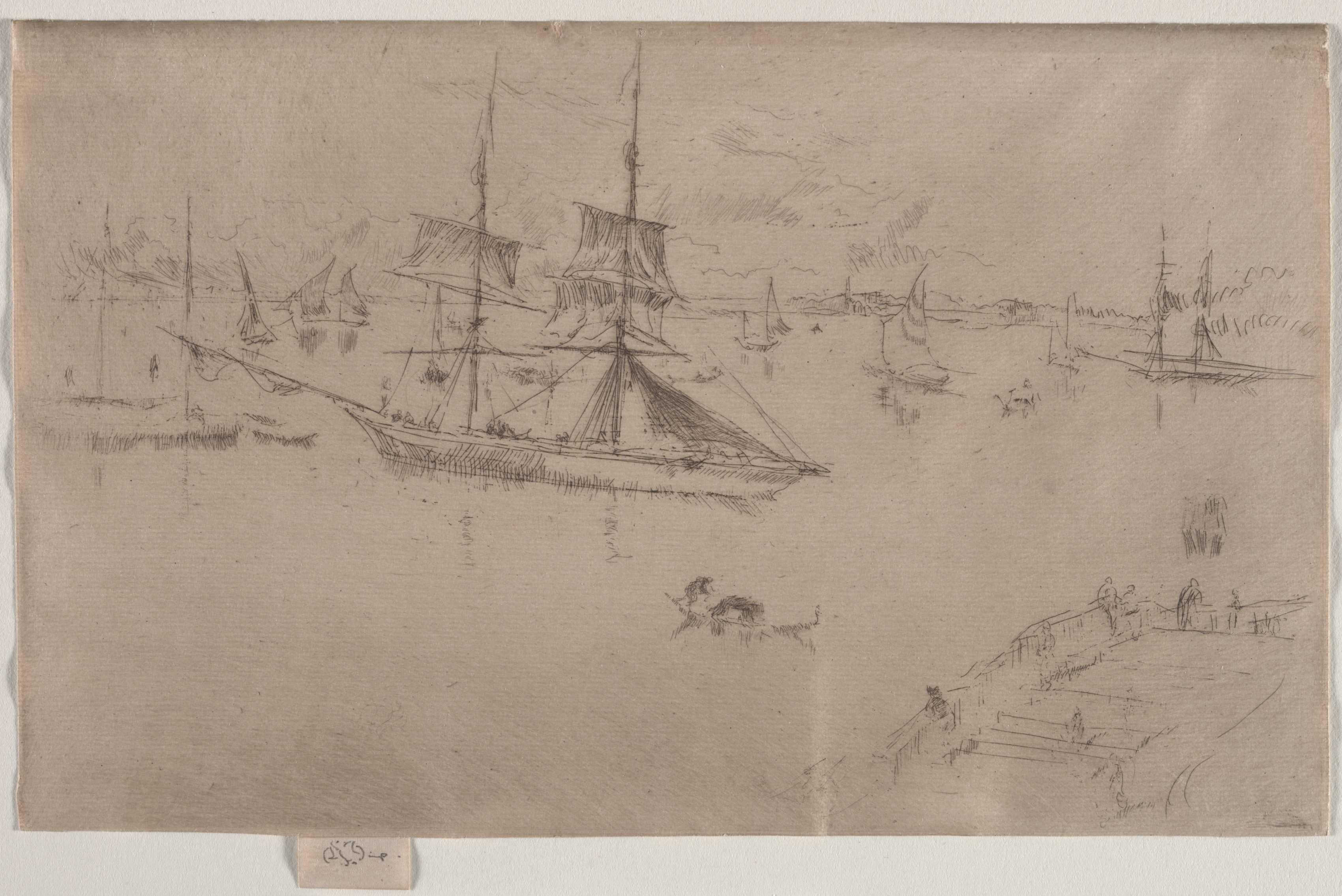 The Lagoon, Noon by James McNeill Whistler. A sketch on brown paper of a body of water with boats. A large boat with two masts and billowing sails on the left. Several smaller boats and a distant shoreline. A set of stairs leading to a flat surface in the foreground on the right. People standing on the flat surface. A cloudy sky.