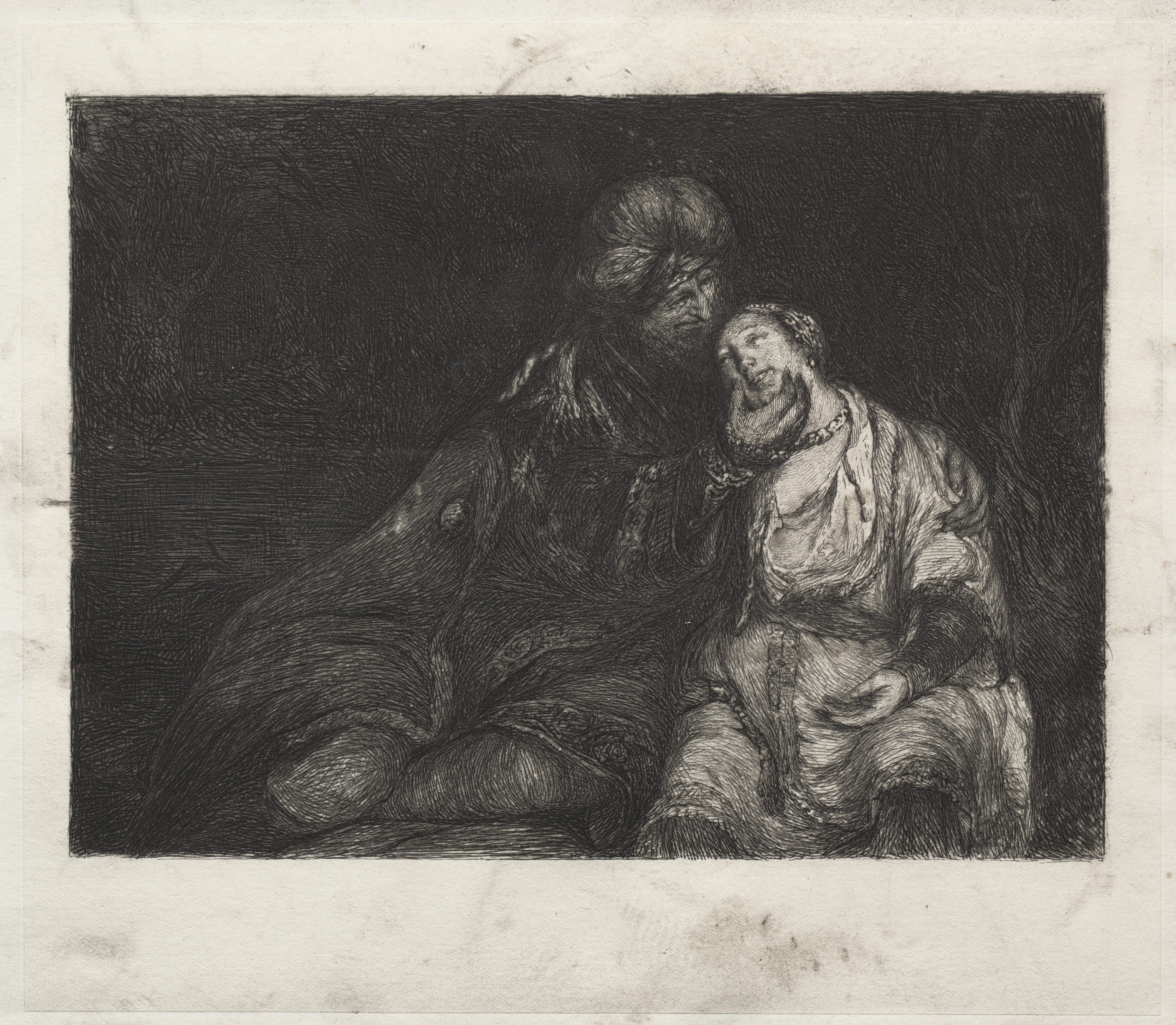 The image depicts a black and white drawing of two figures. The drawing is in a landscape orientation. A man and a woman are sitting next to each other, facing right. The man on the left has a large head with a significant forehead, nose, and beard. He wears a turban and a dark robe. The woman on the right wears a head covering, a necklace, and a light-colored robe. Her head is tilted back, and her mouth is open. The background is dark. The drawing has a white border around it.