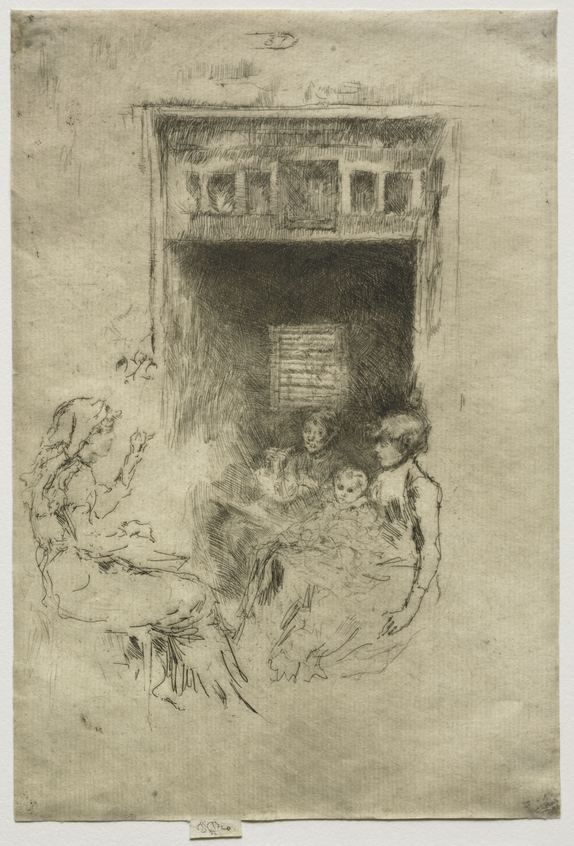 Bead Stringers by James McNeill Whistler. Sepia-toned etching on paper. Depicts three people inside a room; one on far left sitting on a chair with hands raised; one in center behind a table with a baby; one on far right standing. The room has a large archway; rectangular window above with four panes; shuttered window behind table. Loose sketchy lines; detailed facial features minimal. Small rectangular paper strip at bottom center with text. Background has aged paper texture; darker spots; smudges; white border.