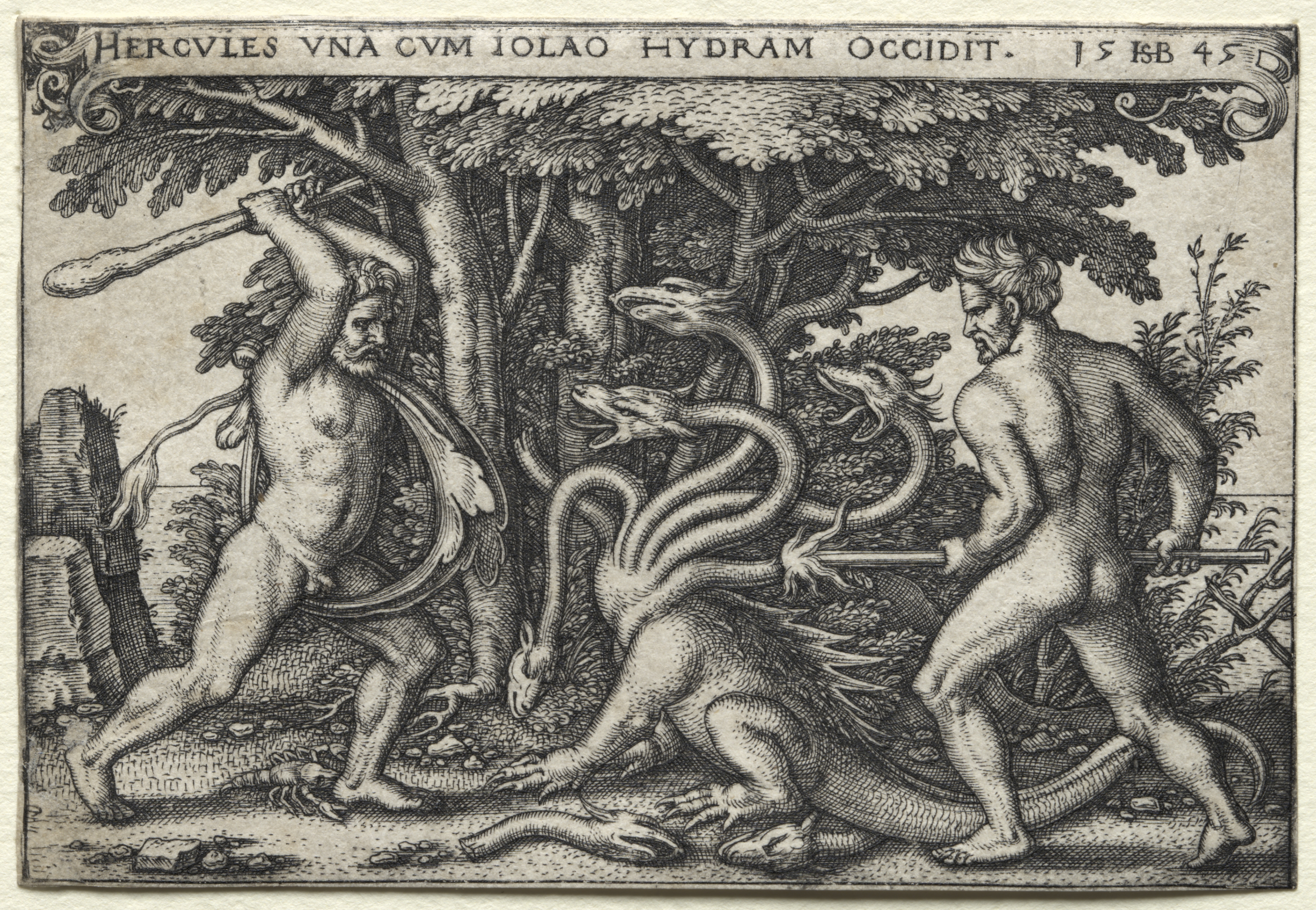 Black and white engraving of two nude male figures and a many-headed snake. The figure on the left is holding a club over his head and appears to have just severed one of the snake's heads. The figure on the right is holding a torch and leaning forward. The snake has six heads and its body resembles a dog's. The scene is in a wooded area. The image includes text at the top.