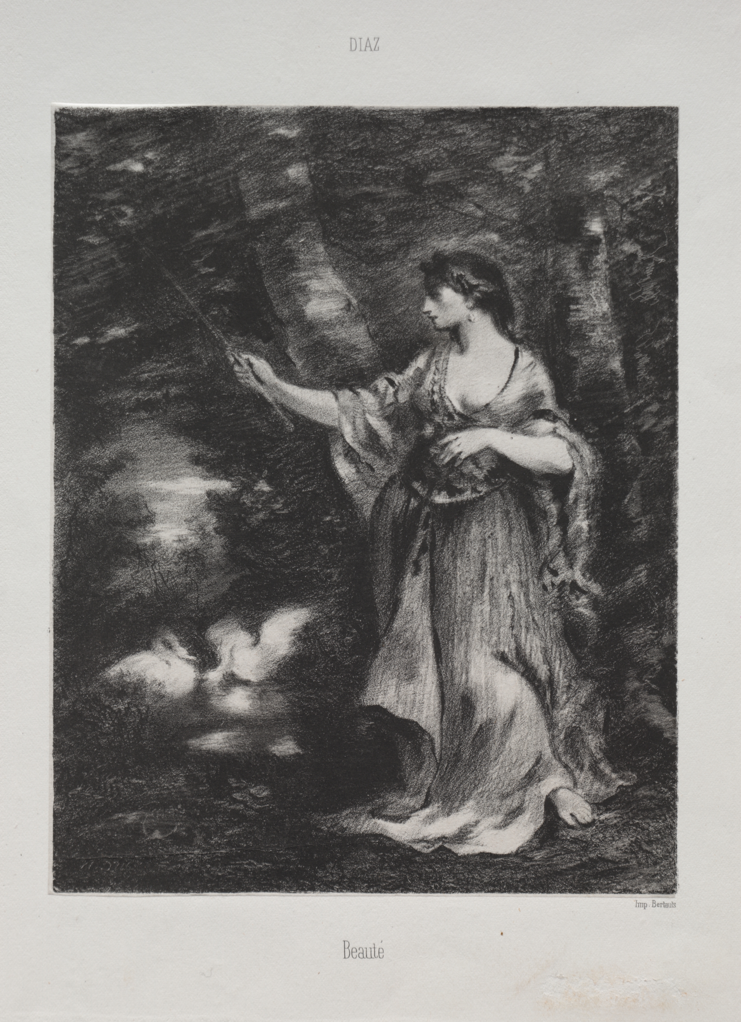 Black and white image of a woman in a long dress standing by a stream. The woman has dark hair, and her body faces slightly right while her head faces left. Her left arm bends across her body at the waist while her right arm extends to the left pointing down toward the stream. She appears to wear a shawl around her shoulders. The dress reaches to her ankles and has a fitted bodice with a gathered skirt. The woman stands on the right side of the image. The stream curves at the bottom left corner. The image is mostly dark shading with areas of lighter shading suggesting tree trunks on either side and foliage throughout. The title "Beauté" appears on the bottom and the artist's name on the top.
