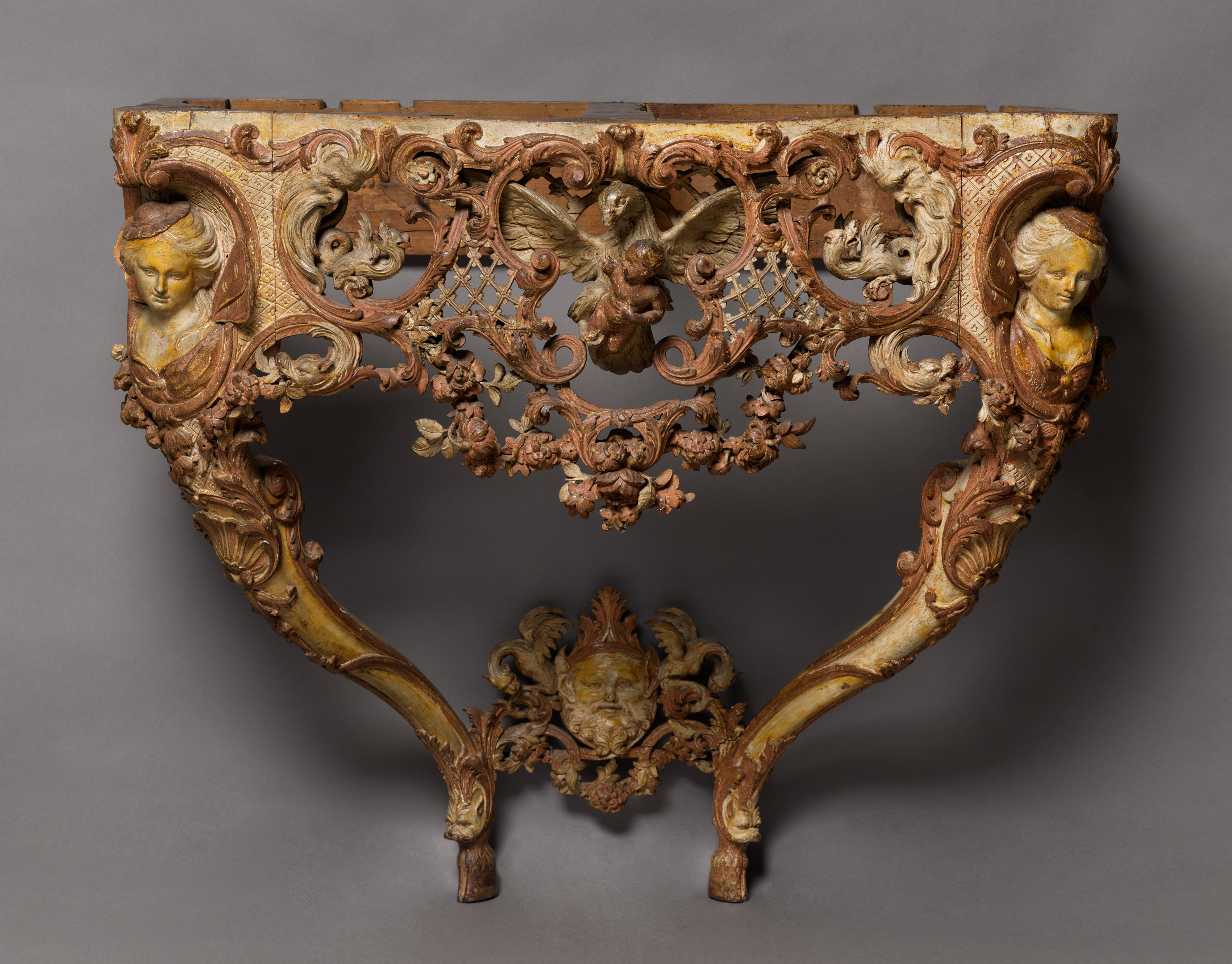 Console Table by an unknown artist. The object is a wooden console table with a semicircular top and curved legs. The table features intricate carvings, including two female heads on either side of the top, a cherub in the center, two other figures on either side of the cherub, and a male face on the bottom center. The carvings also include floral patterns and scrollwork throughout the piece. The table has a gold and brown color scheme. The background of the image is a solid gray color.