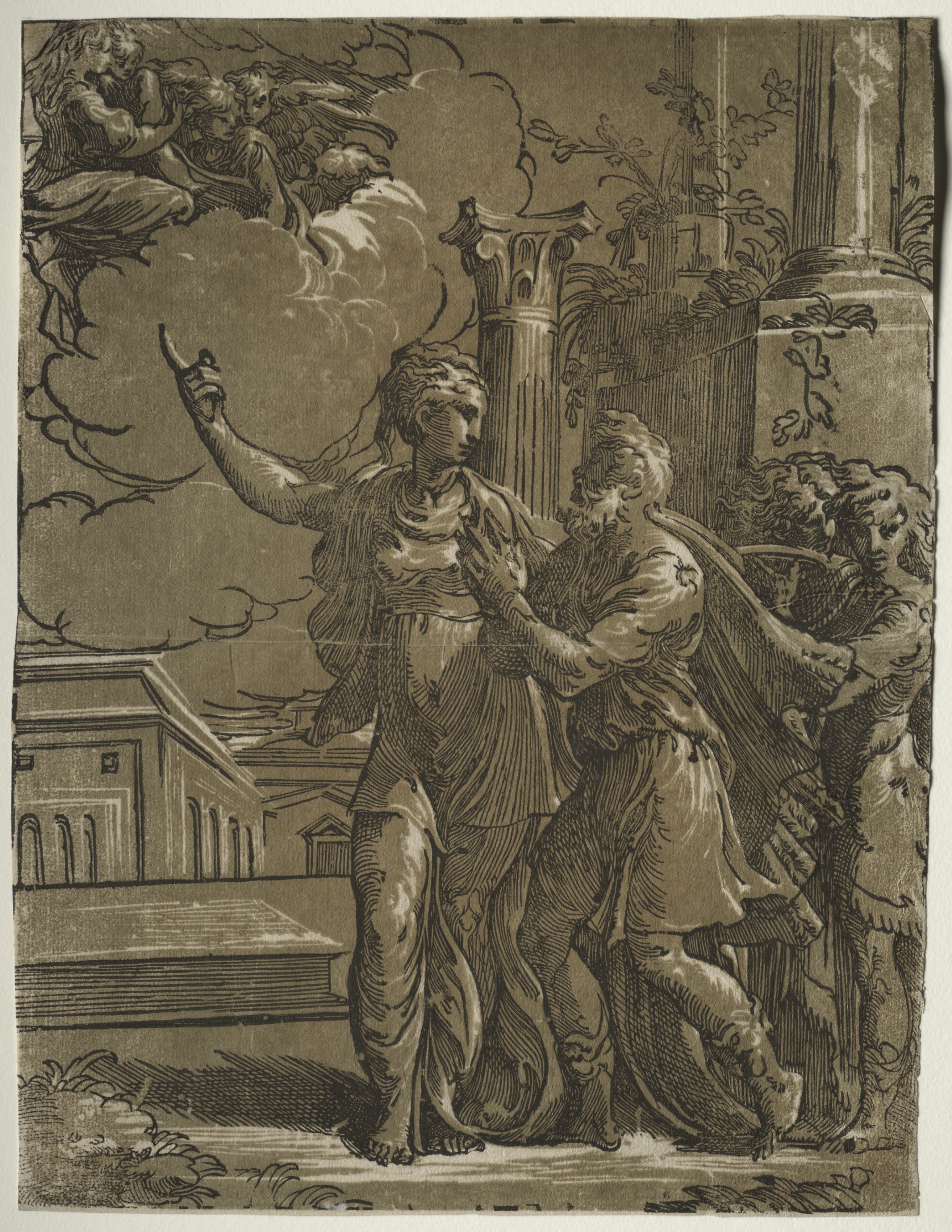 The image depicts a scene with a woman and a man. The woman stands on the left, barefoot, wearing a long dress, with her left arm raised and index finger pointing up. The man, wearing a short tunic and cape, stands with his body angled to his right, his right hand on the woman's right arm. A third figure, wearing a short tunic and cape, stands behind them on the right. In the background, there are buildings, columns, and foliage. Three figures, presumably angels, are on a cloud in the top-left corner. The scene is rendered in sepia tones. The title is "Tiburtine Sibyl and the Emperor Augustus" and the artist is Parmigianino.