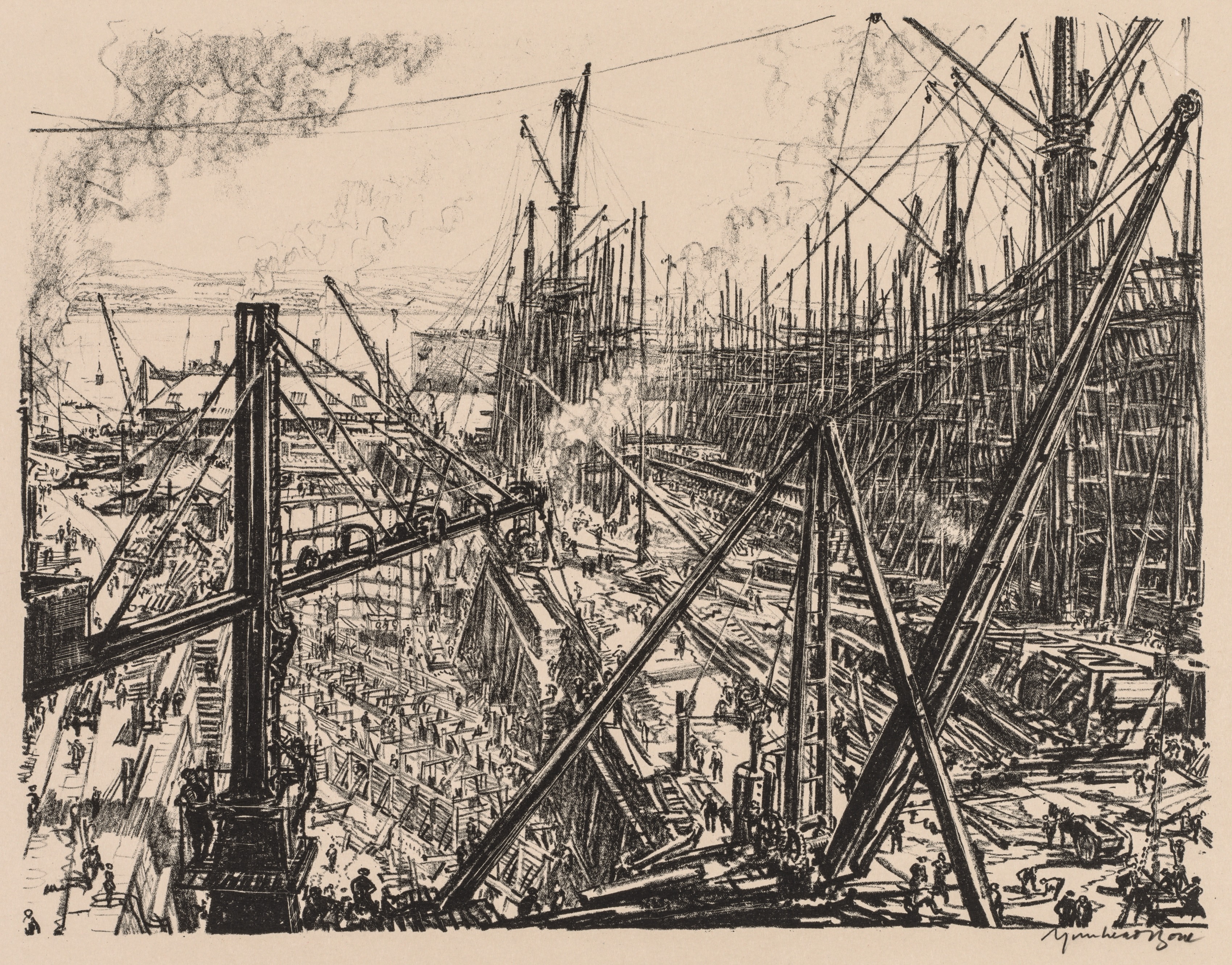 Black and white drawing of a shipyard. The foreground shows a large gantry crane on the left and one on the right with other cranes and supports in between. In the middle ground are dozens of workers, many bent over; several more cranes; piles of lumber; and smoke rising from a fire. In the background are more cranes and buildings; distant hills; and a body of water with ships. The sky is light-colored with dark smoke. The image is on a beige background.