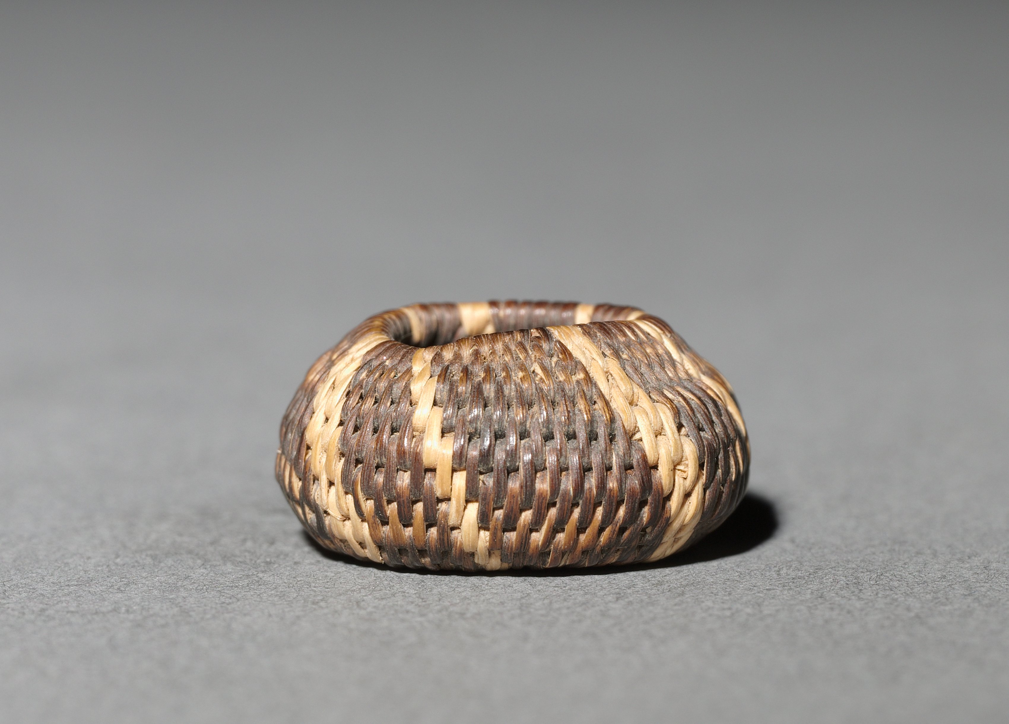The image depicts a small, oval-shaped woven basket. The basket is positioned centrally in the image and is viewed from the side. It features a flat bottom and a circular opening at the top. The basket's body is composed of interwoven strips of light and dark brown material, likely wicker or rattan, in a pattern of alternating light and dark bands. The basket sits on a gray surface, with a subtle shadow cast to the right. The background is a plain gray color that gradually darkens towards the top of the image. The basket is titled 'Miniature Basket'.