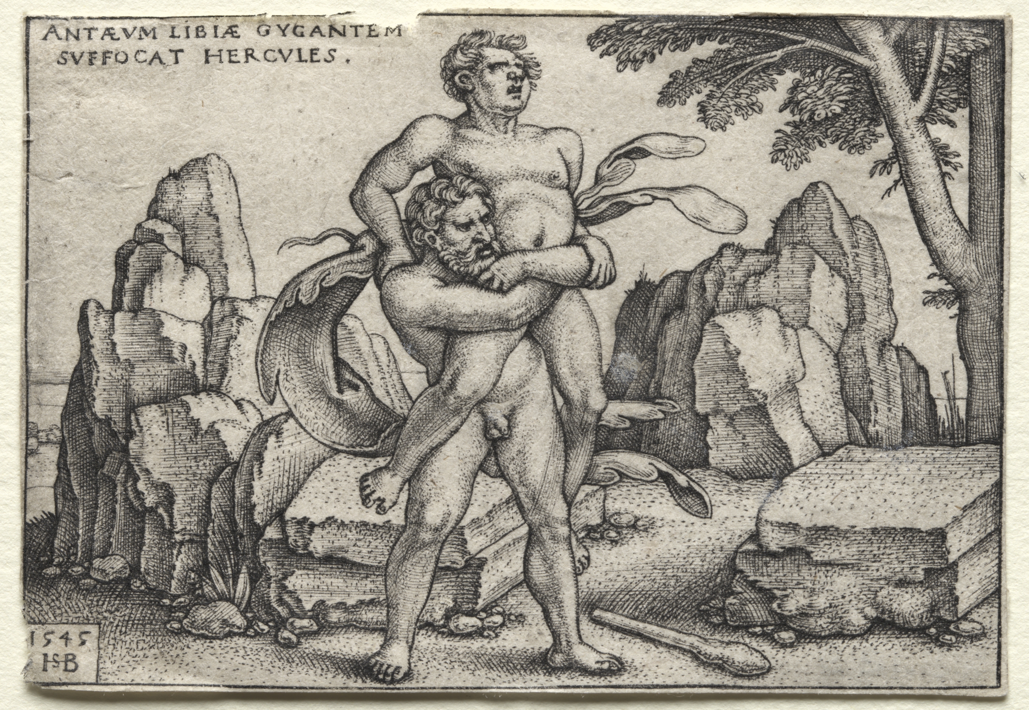 Black and white engraving of a muscular, nude man holding another muscular, nude man in his arms. The man on top is standing upright with his arms wrapped around the man below. The man on the bottom is bent at the knees and appears to be struggling; his head is tilted back and his eyes are closed. The standing man faces right, with short, curly hair and a focused expression. The man he holds has longer, curlier hair and a pained expression. They stand on dirt ground with rocks and boulders scattered around; some boulders are jagged and pointy. Behind them are tree branches with leaves. The scene includes a fallen tree branch on the ground and a partial view of a tree trunk to the right. Latin text is engraved at the top of the image, and a small box with "1545 HB" is at the bottom left.